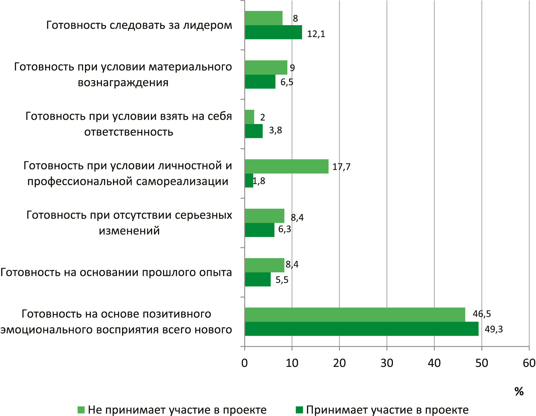 Готовность при условии материального вознаграждения занимает незначительную долю в отличие от прямого анкетирования, которое показало высокую долю достойной заработной платы в качестве мотивационного фактора. Таким образом, можно сделать промежуточный вывод, что методика позволяет выявить скрытые мотивационные составляющие готовности персонала к нововведениям.