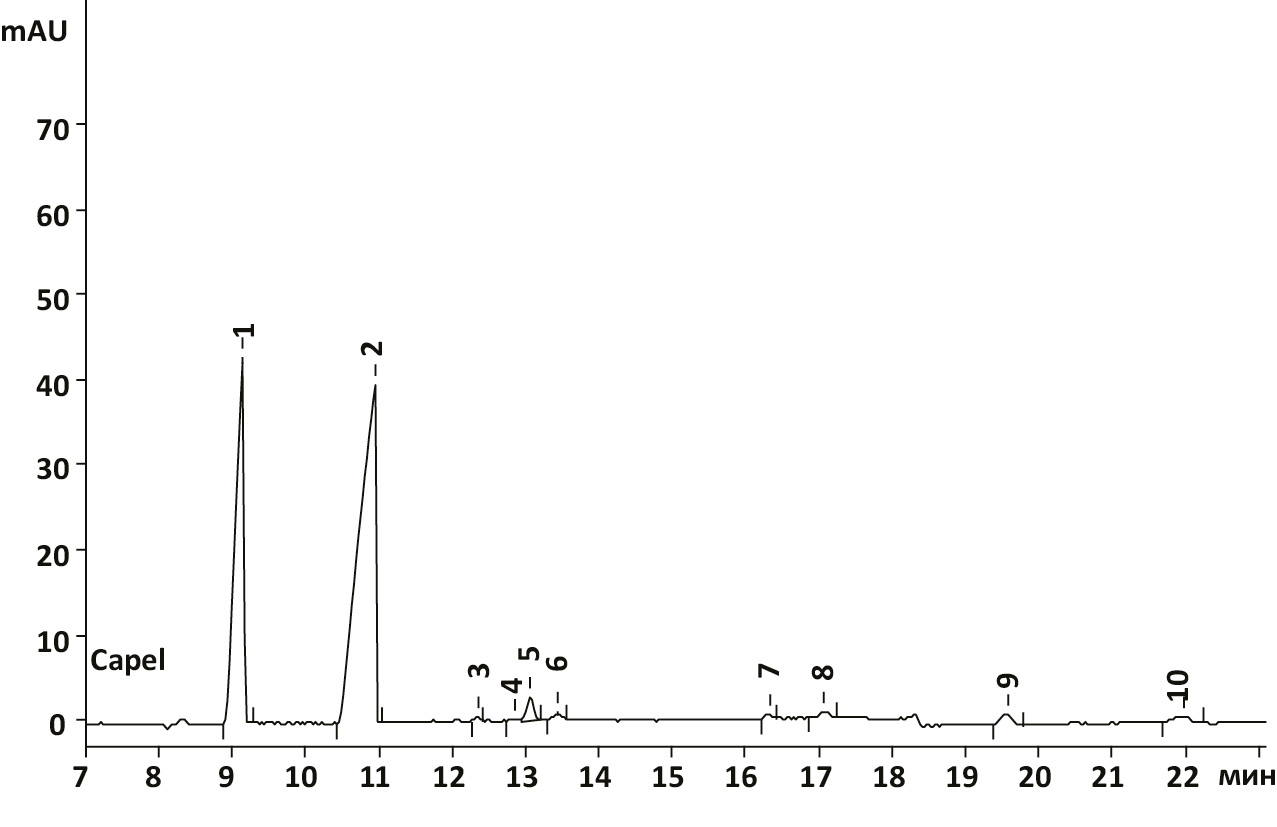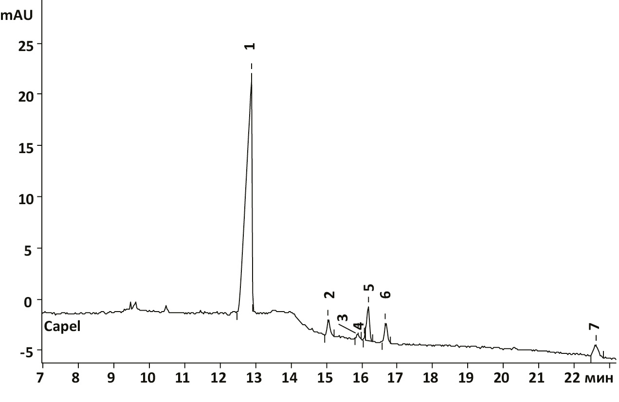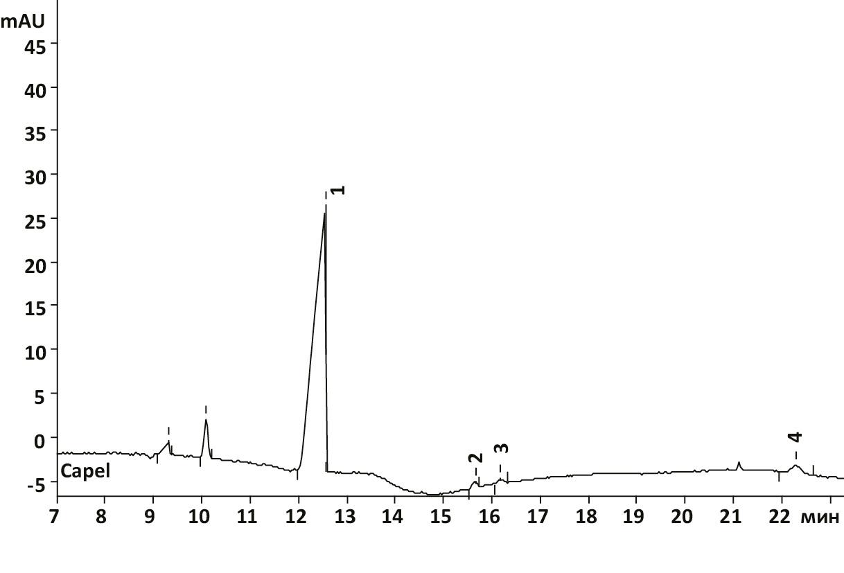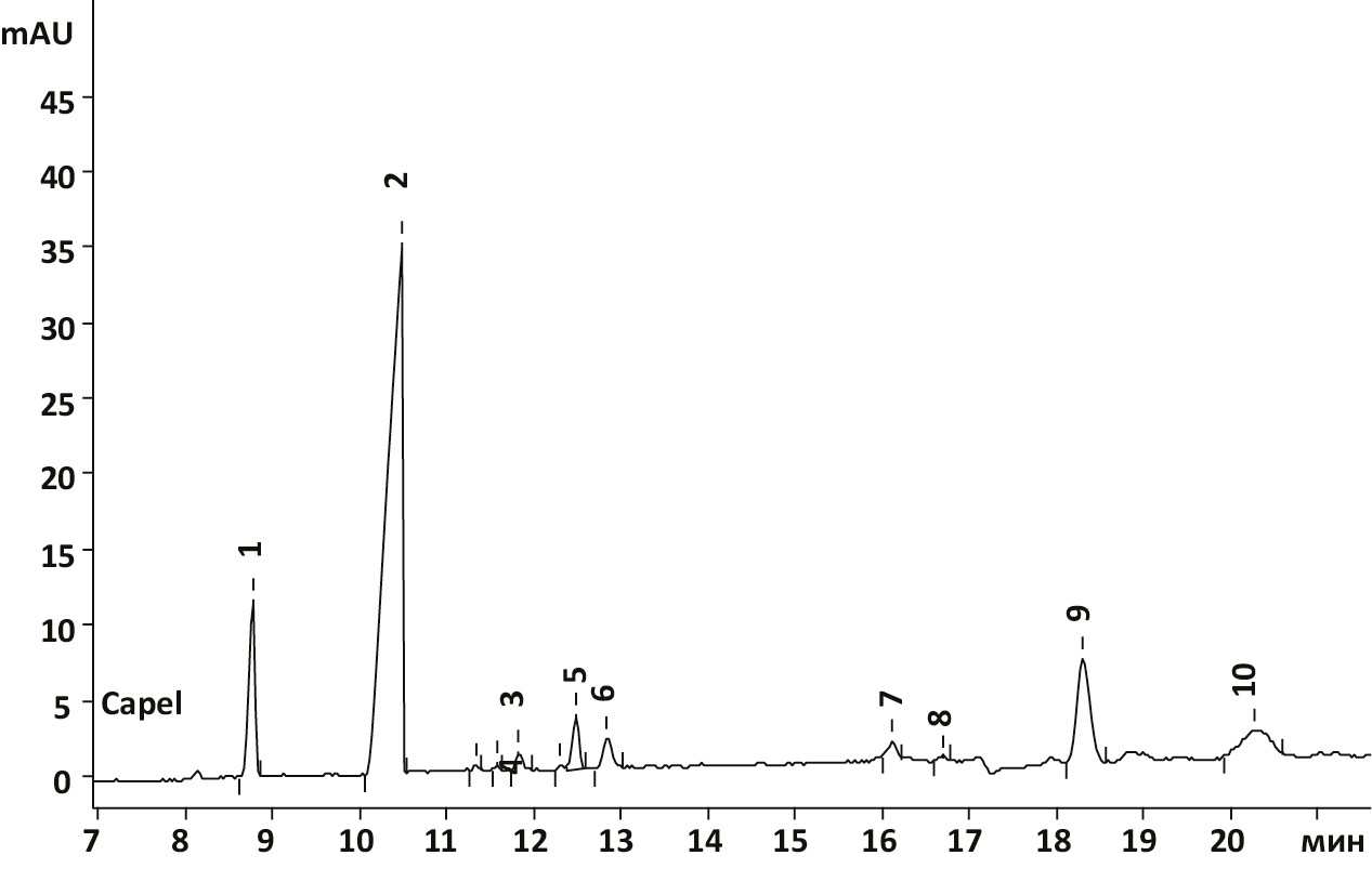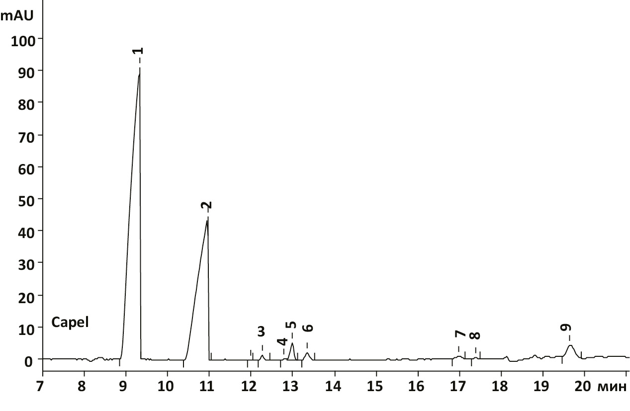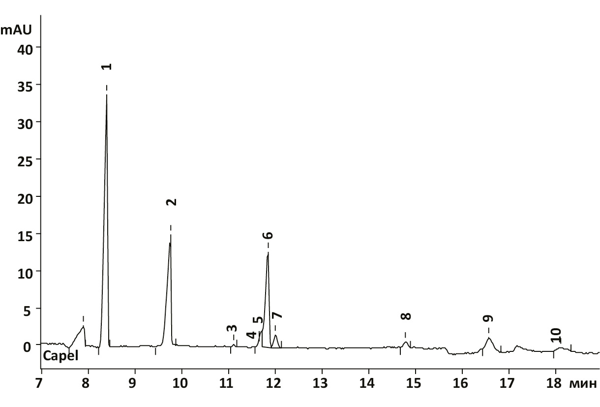 The analysis of the quantitative content of individual organic acids was carried out by capillary electrophoresis (Kapel, Russia). The separation conditions were represented by phosphate buffer. Capillary was: Leff / Ltot = 40/50 cm, ID = 50 μm. The sample injection was 300 mbar s. The voltage was −17 kV. The temperature was +20°С. The detection was indirect, 190 nm5 [5, 27].