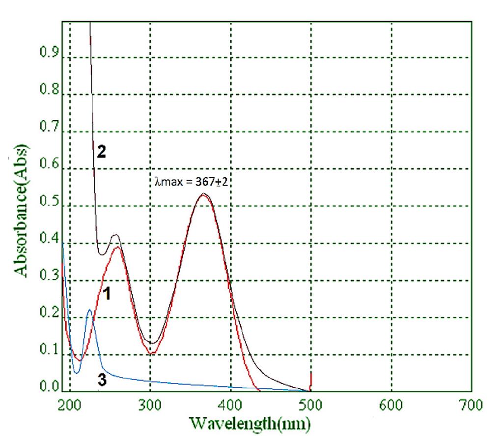 Figure 2 – Ultraviolet absorption spectra of substance furazolidone aqueous solutions (1), effervescent FZ tablets (2) and excipients (3)