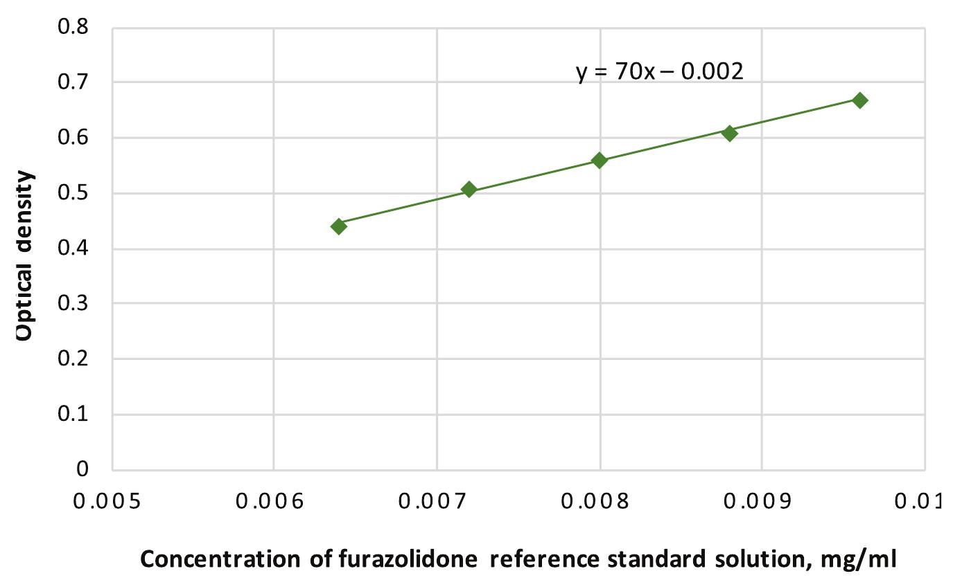 Next, 5 samples of standard furazolidone solutions were prepared with concentrations of 0.032 mg/ml, 0.036 mg/ml, 0.04 mg/ml, 0.044 mg/ml and 0.048 mg/ml (from 80 to 120%). The optical density the five standard furazolidone solutions obtained after the dilution with concentrations of 0.0064 mg/ml, 0.0072 mg/ml, 0.0080 mg/ml, 0.0088 mg/ml and 0.0096 mg/ml was measured. A linear regression analysis of the data obtained, calculated by the least squares method, made it possible to establish that the dependence of the optical density of furazolidone on its concentration is linear and is described by the equation y = 70.000x – 0.002 (Fig. 3). The correlation coefficient (r), equal to 0.99809, meets the necessary condition |r| ≥ 0.9910.