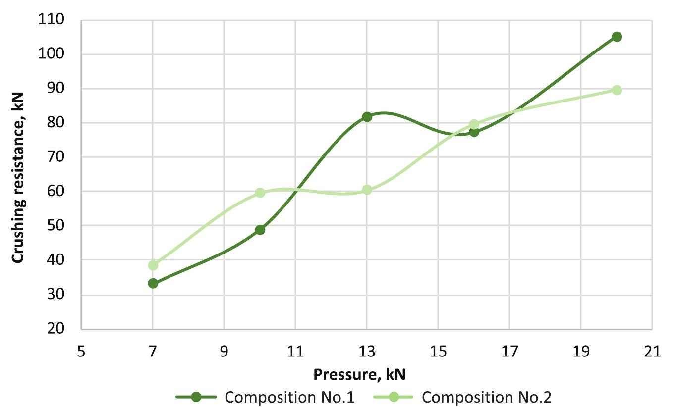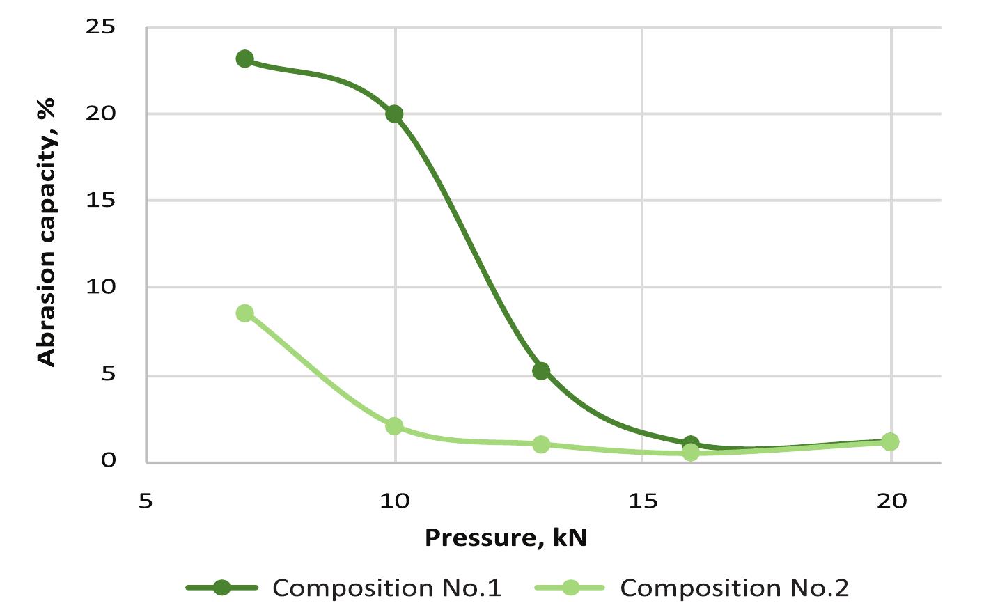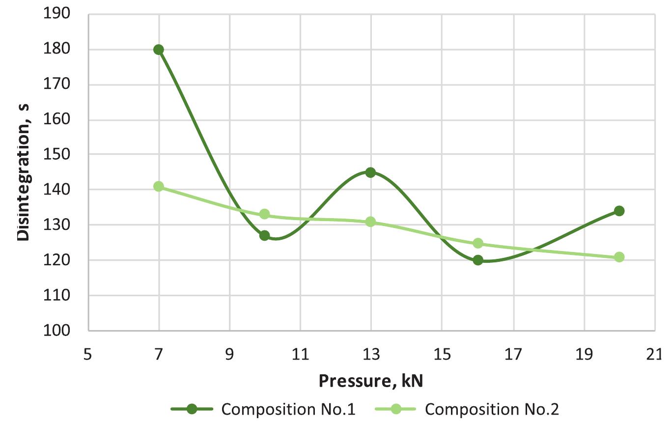 In the work, a manual hydraulic “Testing Press” (PRG brand, VNIR, Russia) was used. Model tablets weighing 3.800 and 3.500 g for compositions No. 1 and No. 2, respectively, were produced at different compacting pressure values on flat-cylindrical puncheons with a diameter of 25.0 mm.