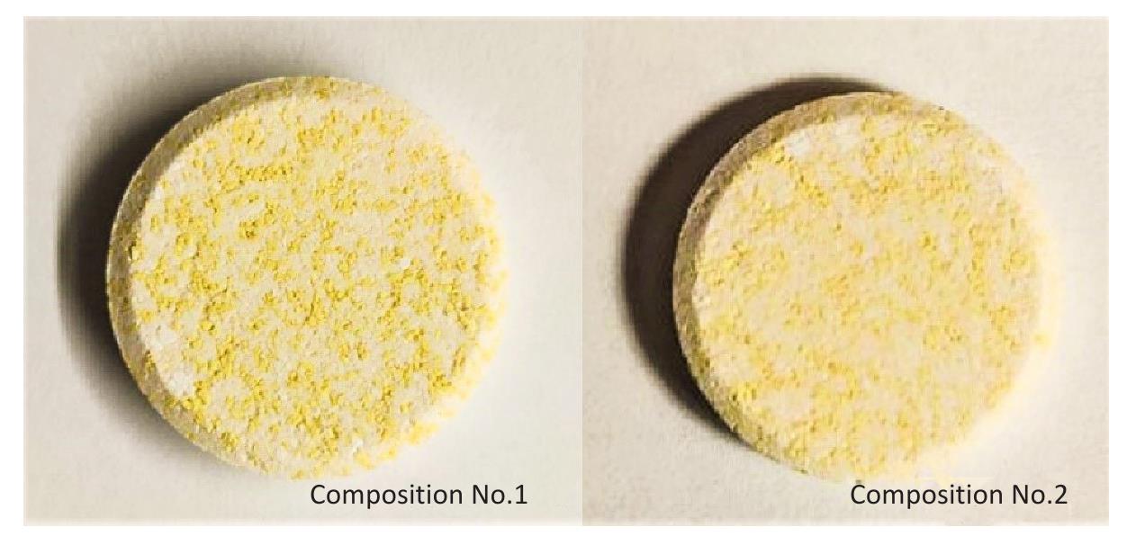 To obtain granulates of compositions No. 1 and No. 2, the basic and acid granules were mixed at the ratios of 1.0:1.3 and 1.0:1.1, respectively, and a lubricating excipient, sodium benzoate, was introduced in the amount of 2% of the powdered mass.