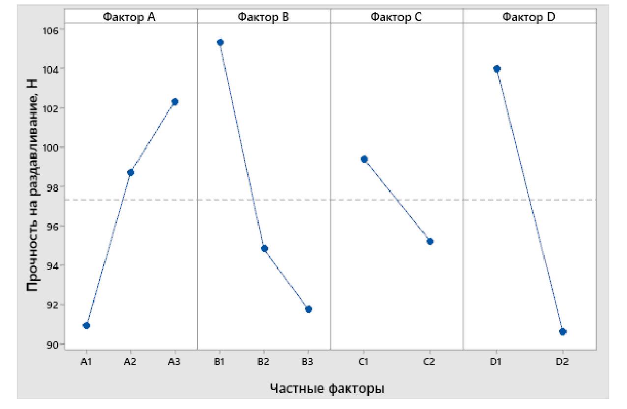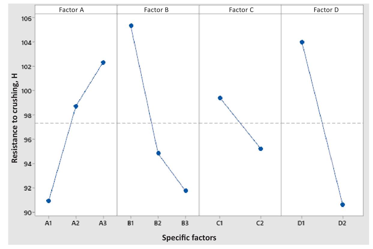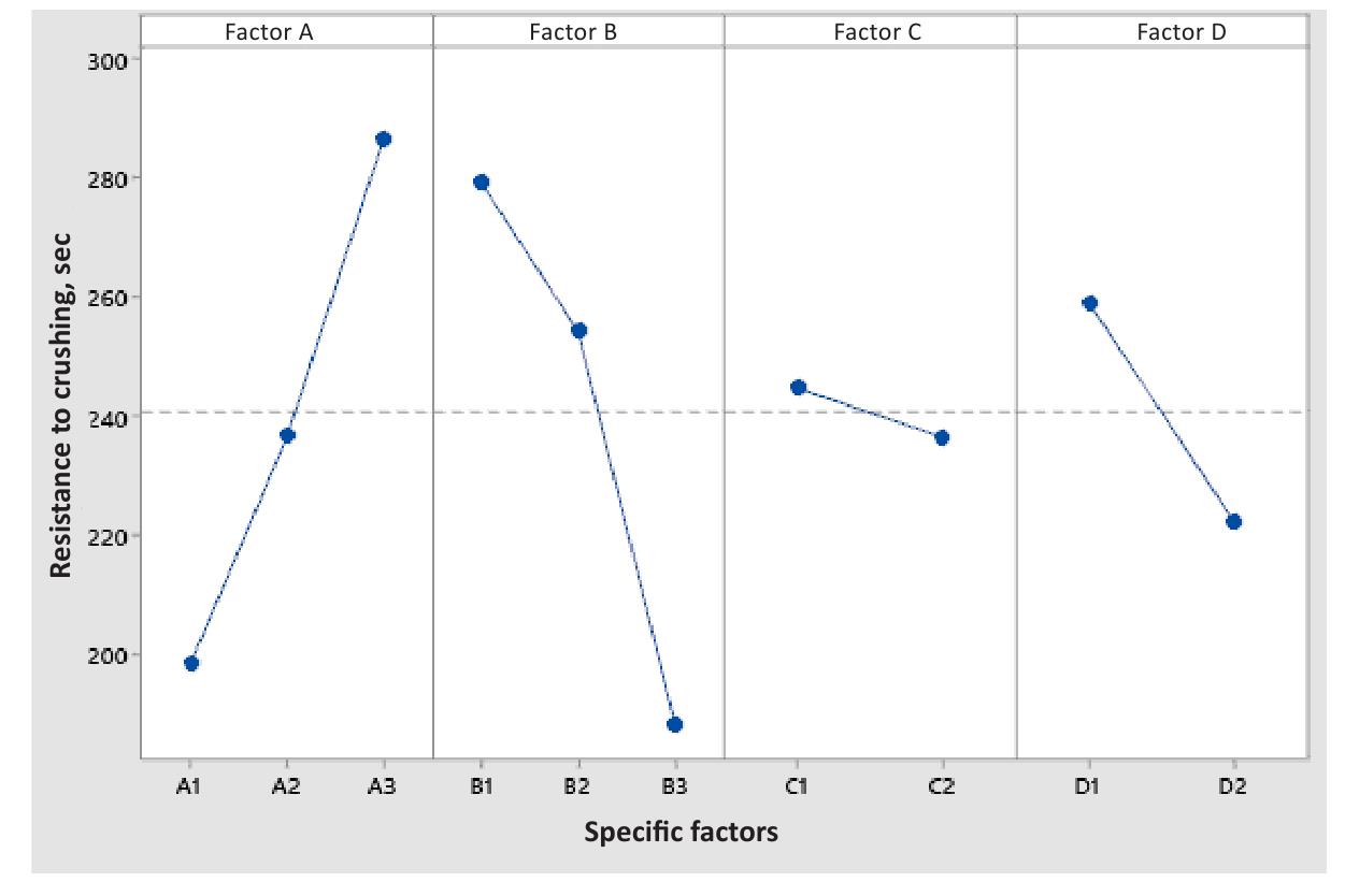 Figure 2 – Graph of the influence of the main factors effects on the average values of tablets GML-1 resistance to crushing
