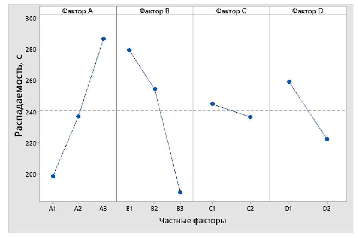 Factors A and B, as well as factor D, had a significant effect on the disintegration rate, as it was expected. The most significant effect was produced by the amount of a disintegrant, and the next was the type of disintegrant and the process of introducing this disintegrant into the tablet mass.