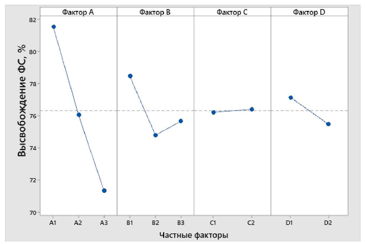 These effects can be explained by the functional purpose of this group of substances. The disintegration time was also affected by interactions between the type, amount and process of adding disintegrant at the stage of dusting, since the total amount of disintegrant affects the amount of disintegrant inside the granules and in the dusting, respectively, exacerbating the influence of this factor. Factor C had the least effect on the disintegration time due to relatively low amounts of lubricating excipients in GML-1 tablets.