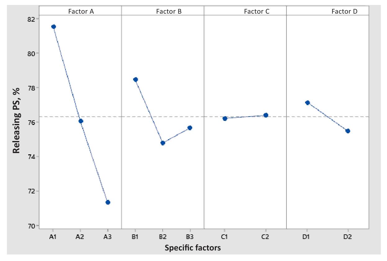 Results. Model compositions were developed and their pharmaceutical and technological properties were studied. These results have been analyzed, the degree of these factors’ influence and their interactions have been determined. In most of the cases considered, the interactions of the factors did not cause a significant change in the optimization criteria. With an increase in the amount of a disintegrant, the disintegration time decreased unevenly, so an increase in the amount of these excipients from 4 to 6 mg had a stronger effect than from 2 to 4 mg. Factor B affected the release degree non-linearly. Factor A influenced all the optimization criteria considered, especially a PS release. The best release and disintegration were observed with crospovidone, which was of a particular importance when processing the test results using a generalized desirability method.