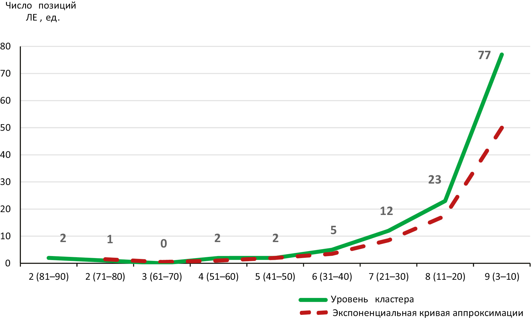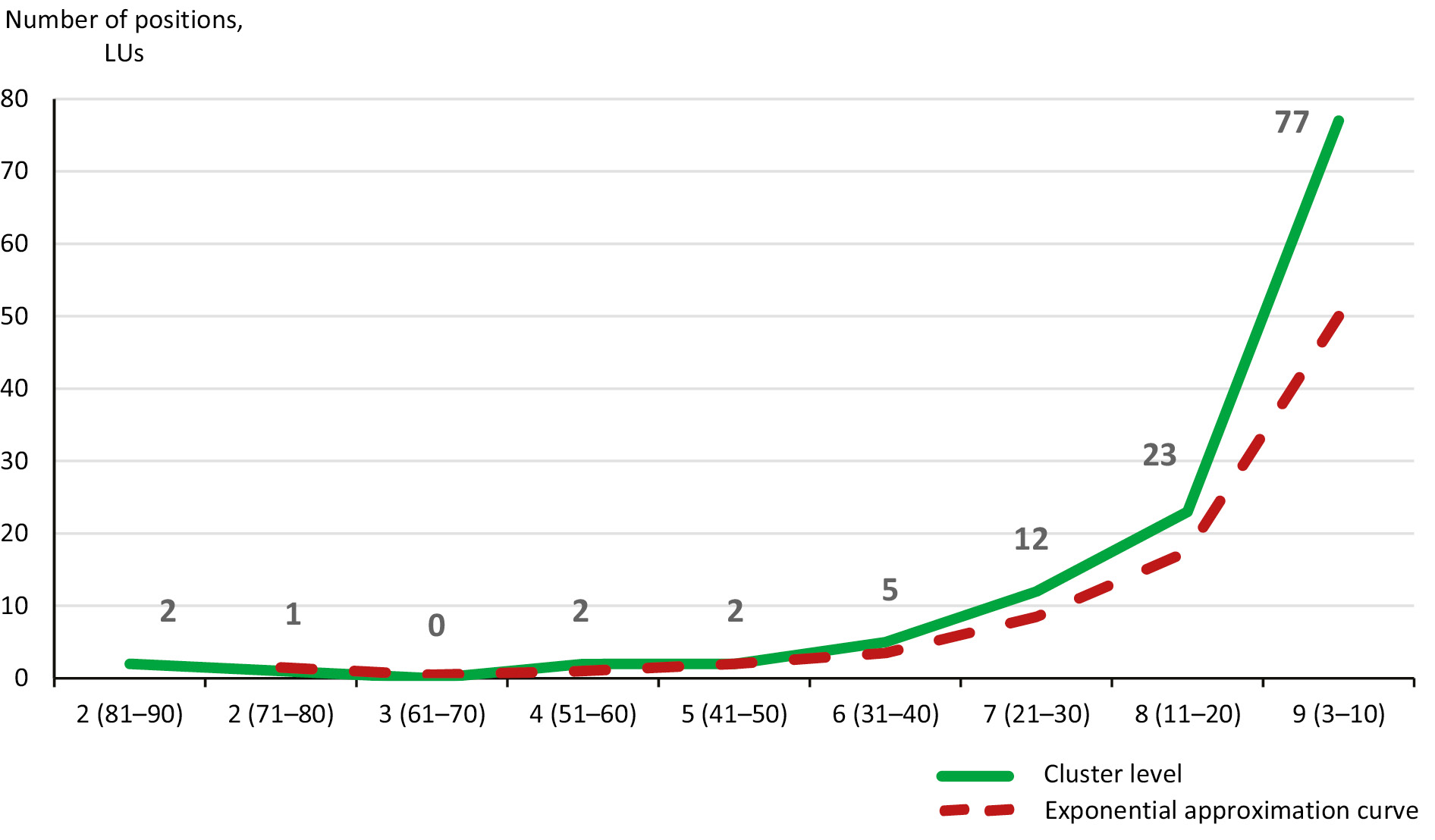 The third (combined) set of the analytical data included 124 LUs with a mentioning frequency from 3 to 88. When grouping LUs by frequency with an interval of 10, 9 hierarchical levels were formed. Fig. 1 shows a statistical distribution of LUs by the established levels (a blue curve), which is described by an exponential curve using the formula (1):