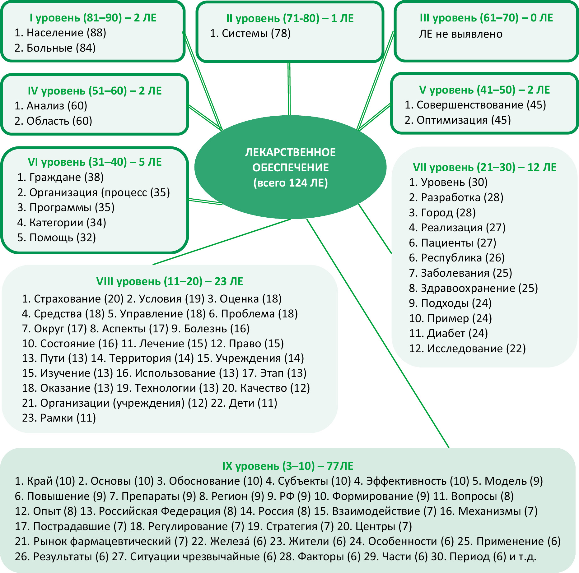 Based on the foregoing, a mechanism for the formation of a “cluster core” was developed. A new vocabulary first appears at level IX and can quickly gain a foothold there or quickly go to level VIII (the area of a sharp rise on the exponential curve in Fig. 1); this is the vocabulary operational part of the system for providing the population with medicines. “Borderline” level IX is characterized by the vocabulary that actively penetrates the cluster as it is necessary to promptly solve new organizational and managerial tasks, set by the state for the healthcare system or arising from the practical need for such measures, in the field of providing the population with medicines.