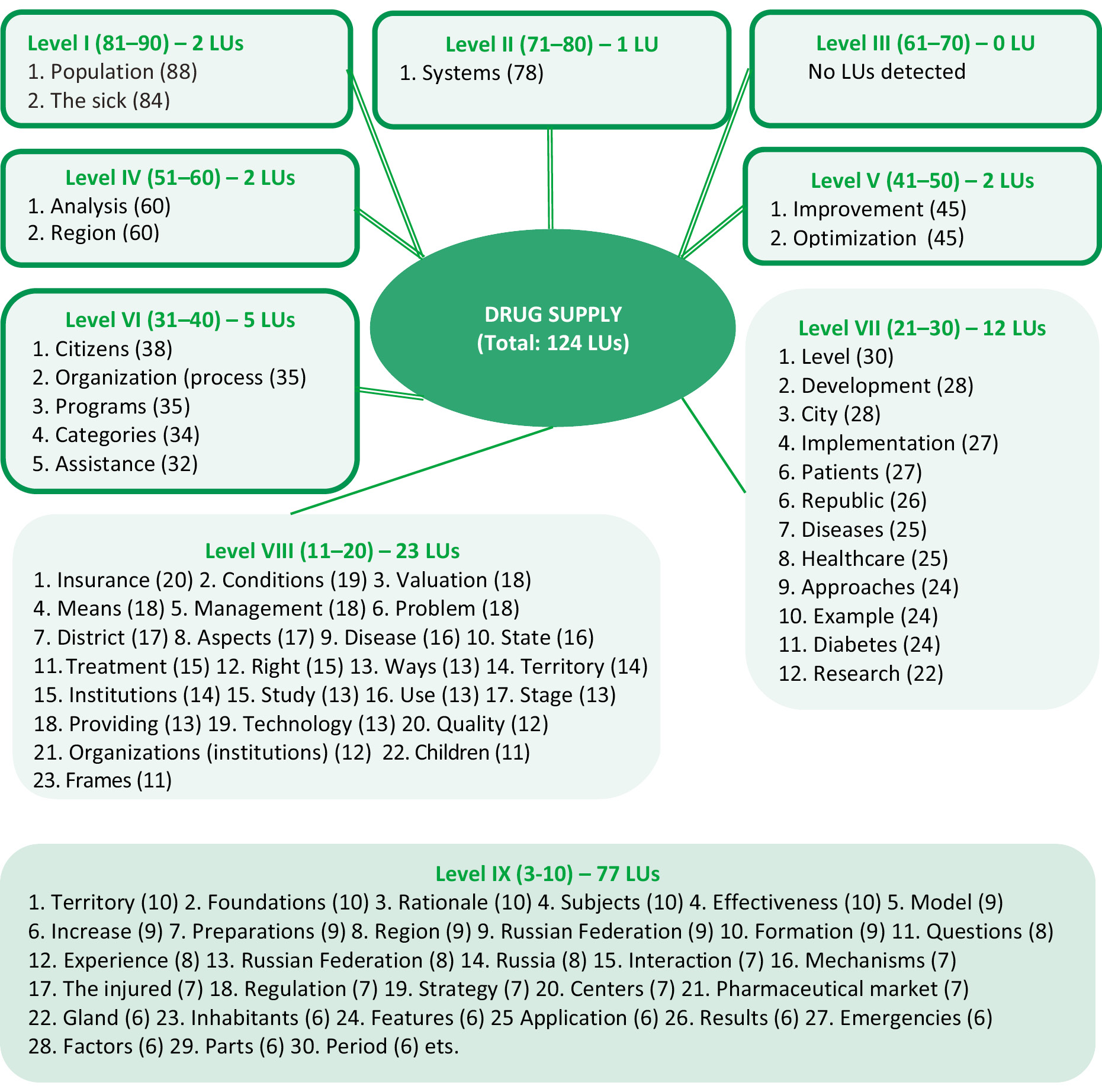 Figure 1 – Distribution of LU by levels in the united cluster of “Medicinal provision” concept for period of 1995–2019