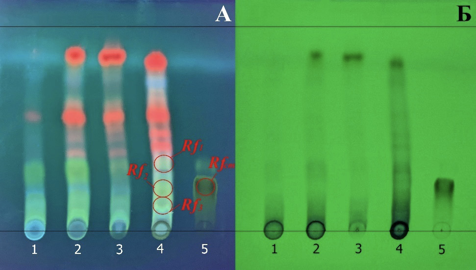 Note: A – detection in UV light at 365 nm after AlCl3 treatment; В – detection after DSА treatment. 1 – 40% water-ethanolic extraction; 2 – 70% water-ethanolic extraction; 3 – 96% water-ethanolic extraction; 4 – N. sativa L. herb tincture; 5 – SS rutin.