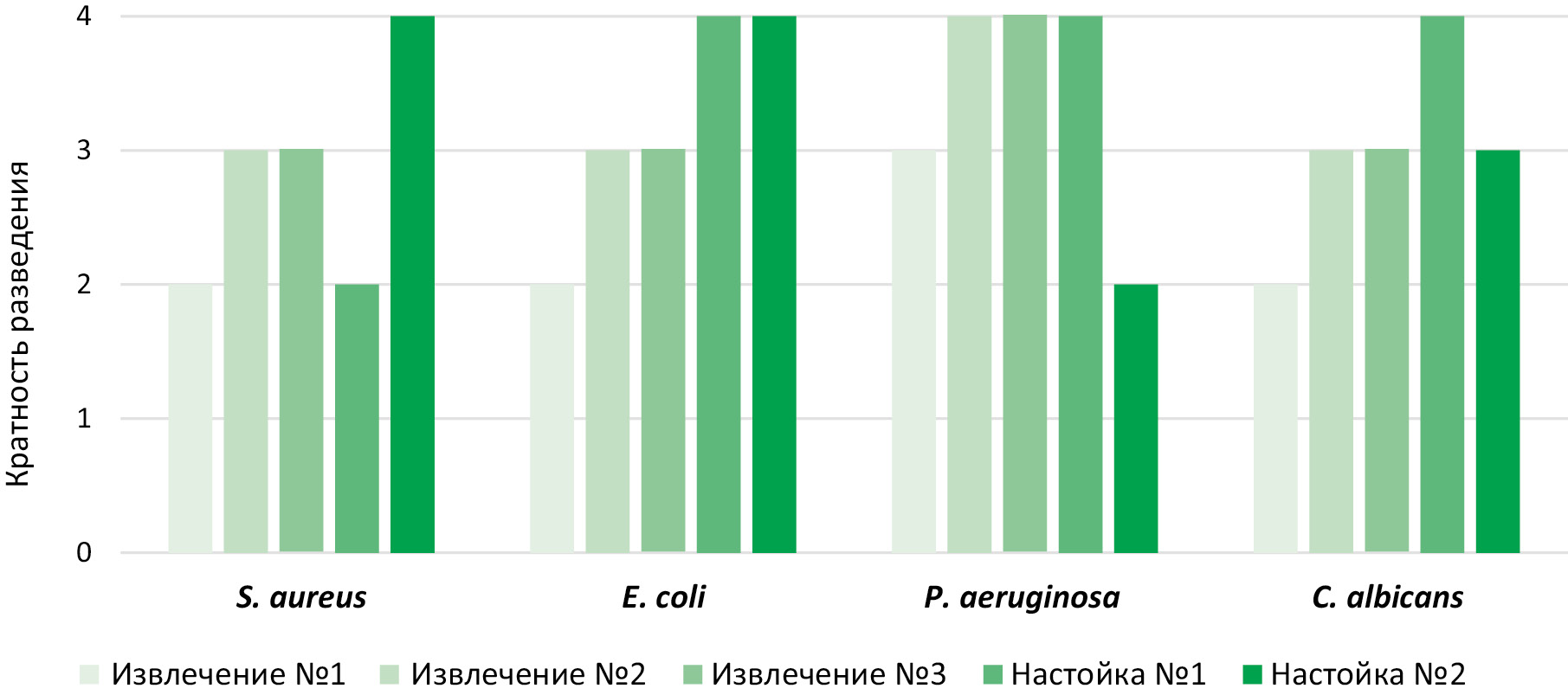 Using a micropipette with a sterile tip, the working solution in the amount of 0.5 ml was introduced into the first tube containing 0.5 ml of broth. Then it was thoroughly mixed up, and with a new sterile tip, 0.5 ml of the test solution in the broth was transferred into the second tube containing initially 0.5 ml of broth. The procedure had been repeated until the entire required dilution series was prepared. 0.5 ml of the broth was removed from the last test tube. Thus, a number of test tubes with the solutions of the tested samples of the water-ethanolic extractions were obtained, the concentrations of which differed in the adjacent test tubes by a factor of 2. Simultaneously, additional series of serial sample dilutions were prepared for testing control strains.