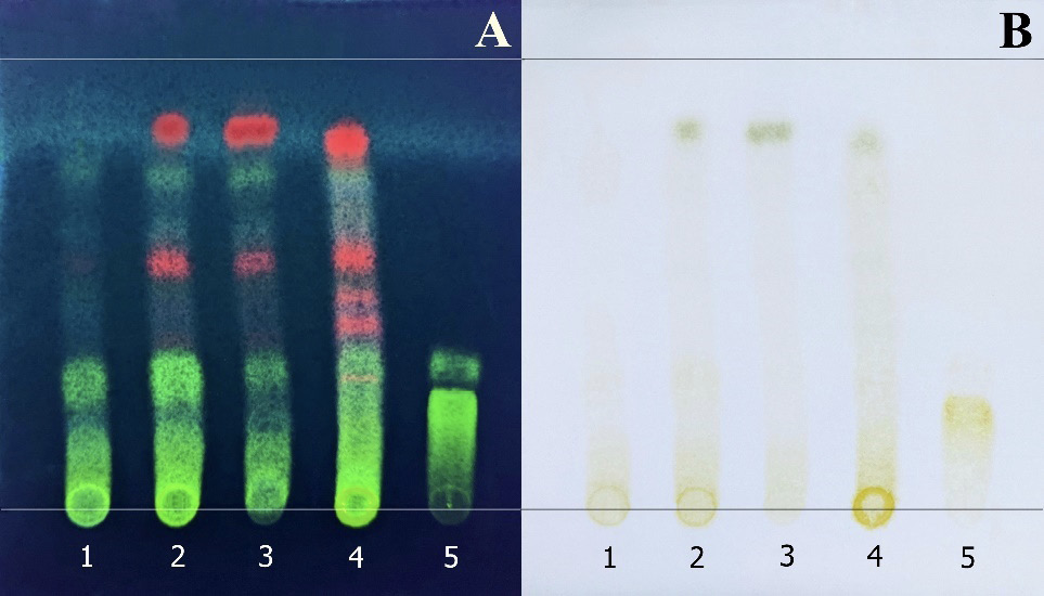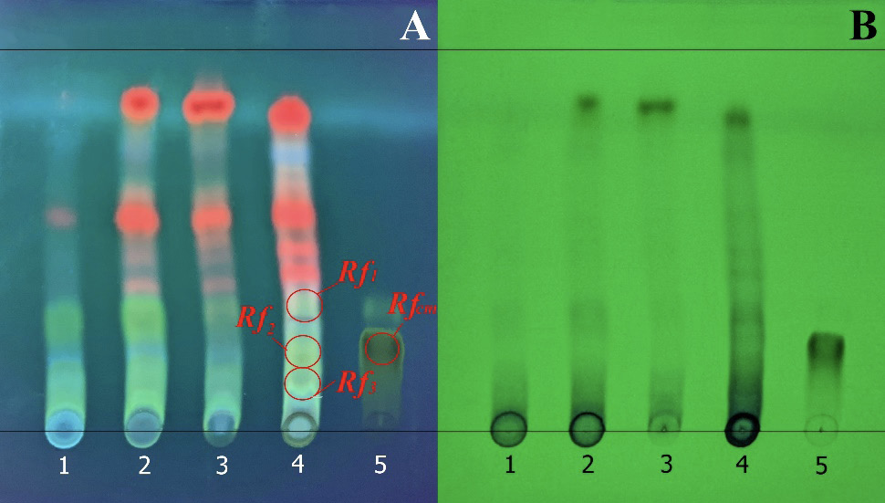 Note: A – detection in UV light at 365 nm; B – detection in UV light at 254 nm. 1 – 40% water-ethanolic extraction; 2 – 70% water-ethanolic extraction; 3 – 96% water-ethanolic extraction; 4 – N. sativa L. herb tincture; 5 – SS rutin.