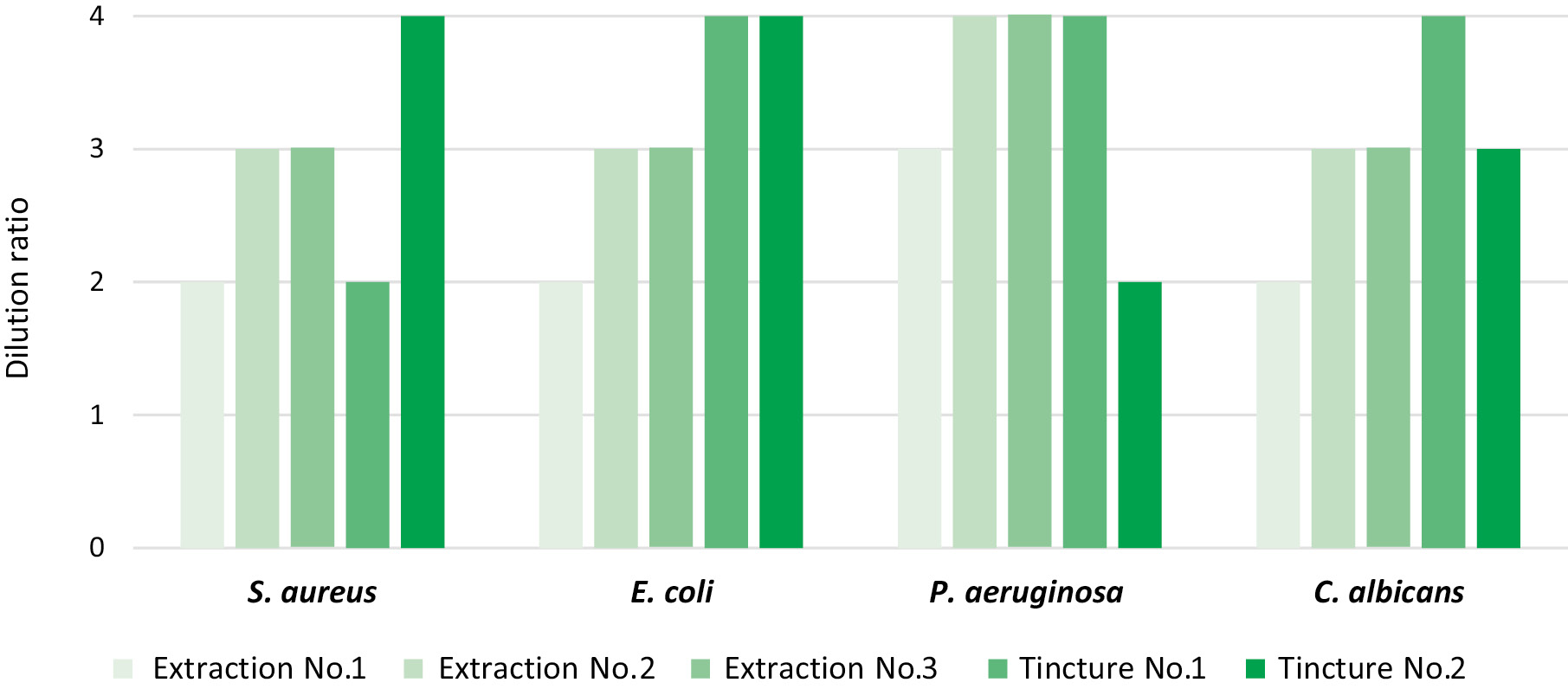 The tested 70% N. sativa L. herbs tincture (the tincture from the N. sativa L. herbs -to-70% ethanol ratio of 1:5) showed the following results. Similar to the extractions in 70% and 96% ethyl alcohol, the anti- microbial effect was observed against the P. aeruginosa strain in a 16-fold dilution, however, besides this prevailing effect, the antimicrobial effect against the E. coli and C. albicans strains increased stopping the growth up to the 16-fold dilution. The effect against the S. aureus strain, on the contrary, slightly decreased to the 4-fold dilution (Fig. 3).