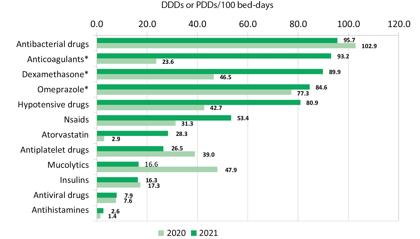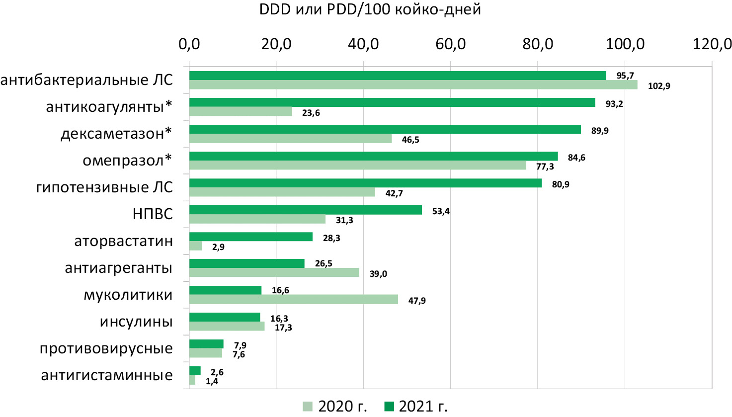 The calculation of DDDs or PDDs/100 bed-days was made for 79 drugs in 2020 and 85 drugs in 2021, among which there were antibacterial drugs; agents affecting hemostasis; GCSs and other immunosuppressants; bronchodilators; mucolytics; surfactant preparations; non-steroidal anti-inflammatory drugs (NSAIDs); antihistamines; the drugs that affect the gastrointestinal tract; insulins; cardiovascular agents; iron preparations and centrally acting preparations (Fig. 1).