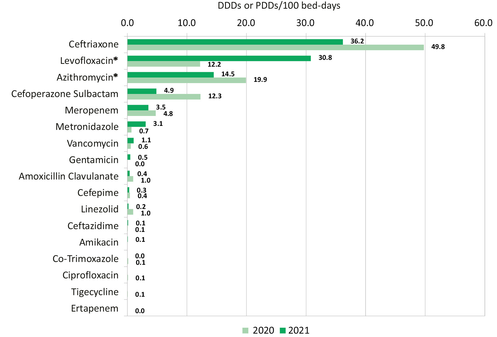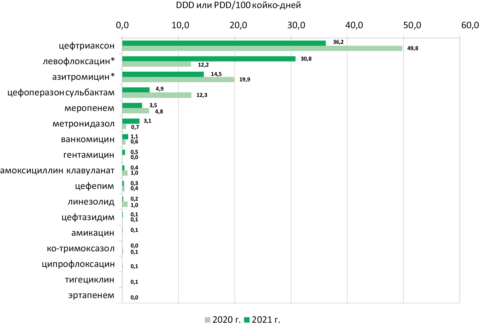 An earlier ABC analysis of drug consumption in facilities [8] revealed a decrease in the share of the expenditure on antibiotics in 2021 compared to 2020. Thus, the purchase of antibacterial drugs in 2020 accounted for 52% of Segment A costs, and in 2021, it was 13.6%. However, their total consumption in terms of DDDs/100 bed-days in 2020 was only 7% higher than in 2021 (102.9 DDDs/100 bed-days in 2020 and 95.7 DDDs/100 bed-days in 2021). A decrease in the relative share of the expenditure on antibacterial drugs in 2021, based on the ABC analysis, is associa- ted to a greater extent with an increase in the expenditure on biological disease modifying antirheumatic drugs (GEBPs) and anticoagulants. It is also caused by a restriction in the purchase of expensive antibiotics in favor of the most affordable ones, rather than a decrease in the frequency of prescribing antibacterial drugs. Thus, it was the calculation of the DDDs/100 bed-days indicator, and not the ABC analysis, which made it possible to evaluate and compare the annual consumption of antibacterial drugs, regardless of the dosing regimen, costs, the number of patients treated, and hospital stays (Fig. 2).