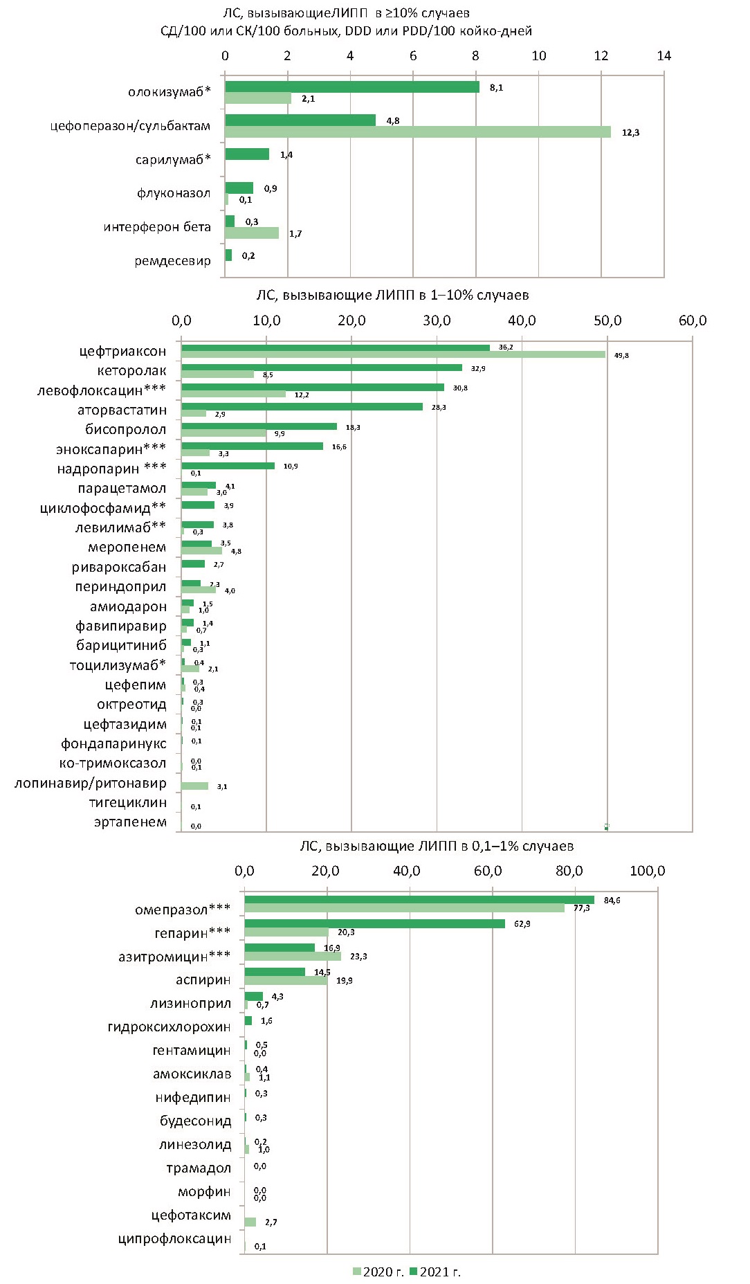 A simultaneous intake of several drugs with a potential hepatotoxicity more often causes a liver damage as a result of a pharmacodynamic interaction. In international10 and Russian databases11,12 a search was conducted on the incidence of DILI for all the drugs used in infectious in-patient hospitals in 2020 and 2021.