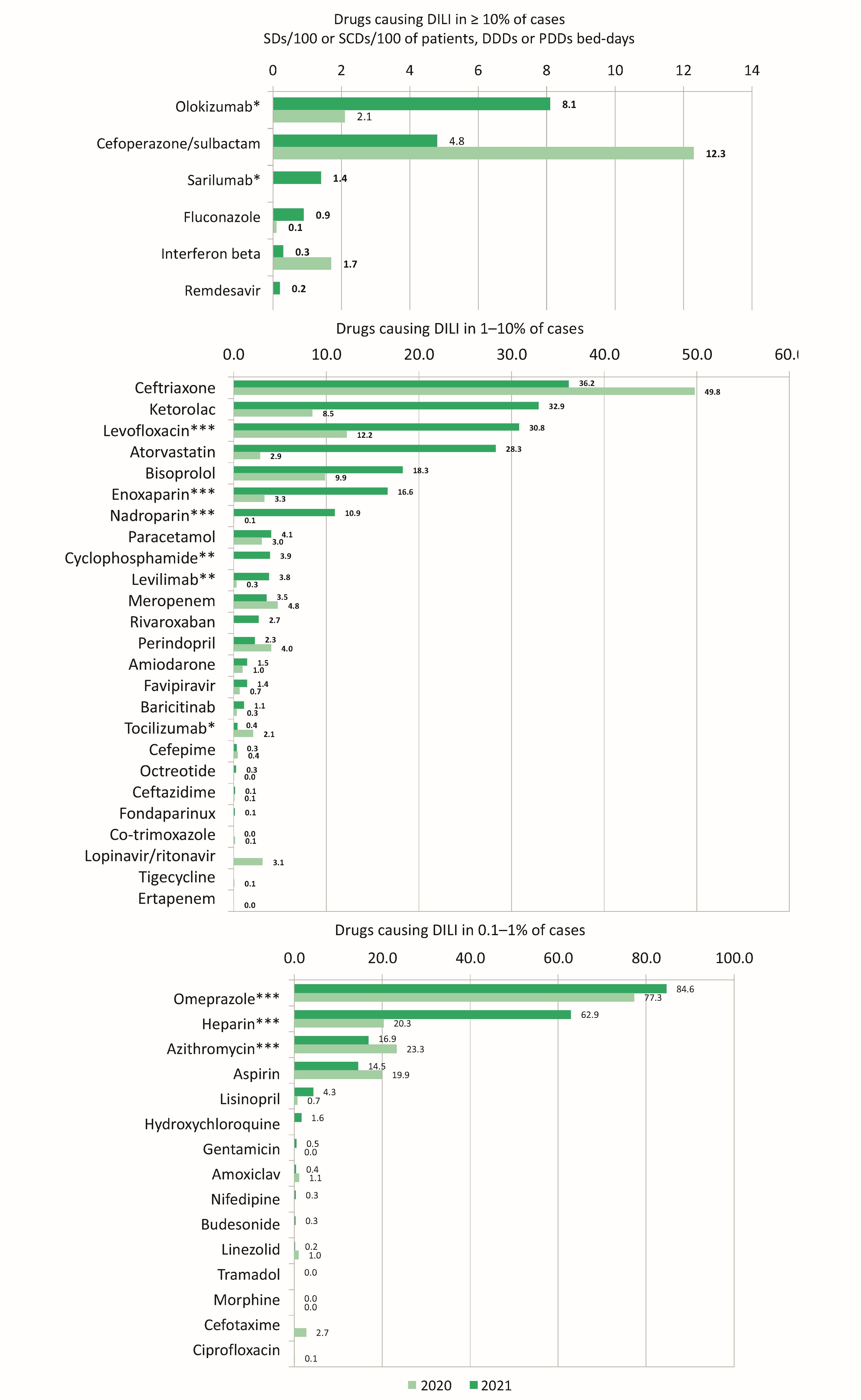Among the drugs used in 2020, only 4 (cefoperazone/sulbactam, interferon beta, fluconazole, and olokizumab) are the drugs that cause DILI in 10% or more of patients. In 2021, the drugs with a severe hepatotoxicity (DILI ≥ 10%) were also joined by remdesevir and sarilumab. The volume of drugs consumption with a severe hepatotoxicity was relatively small. However, the total consumption of drugs that cause DILI in 1–10% of patients (23 drugs in 2020 and 22 drugs in 2021) and 0.1–10% of patients (12 drugs in 2020, 13 drugs in 2021) were several times higher than 100 DDDs/100 bed-days. That was the result of the combined prescription of 2 or more drugs that can cause a liver dysfunction (Fig. 3). The most commonly prescribed groups of drugs with hepatotoxic effects were PPIs, antibacterials, and anticoagulants. The volume of hepatotoxic antiviral drugs consumption was 3.8 DDDs/100 bed-days (lopinavir/ritonavir and favipiravir) in 2020 and 1.8 DDDs/100 bed-days (favipiravir and remdesavir) in 2021.