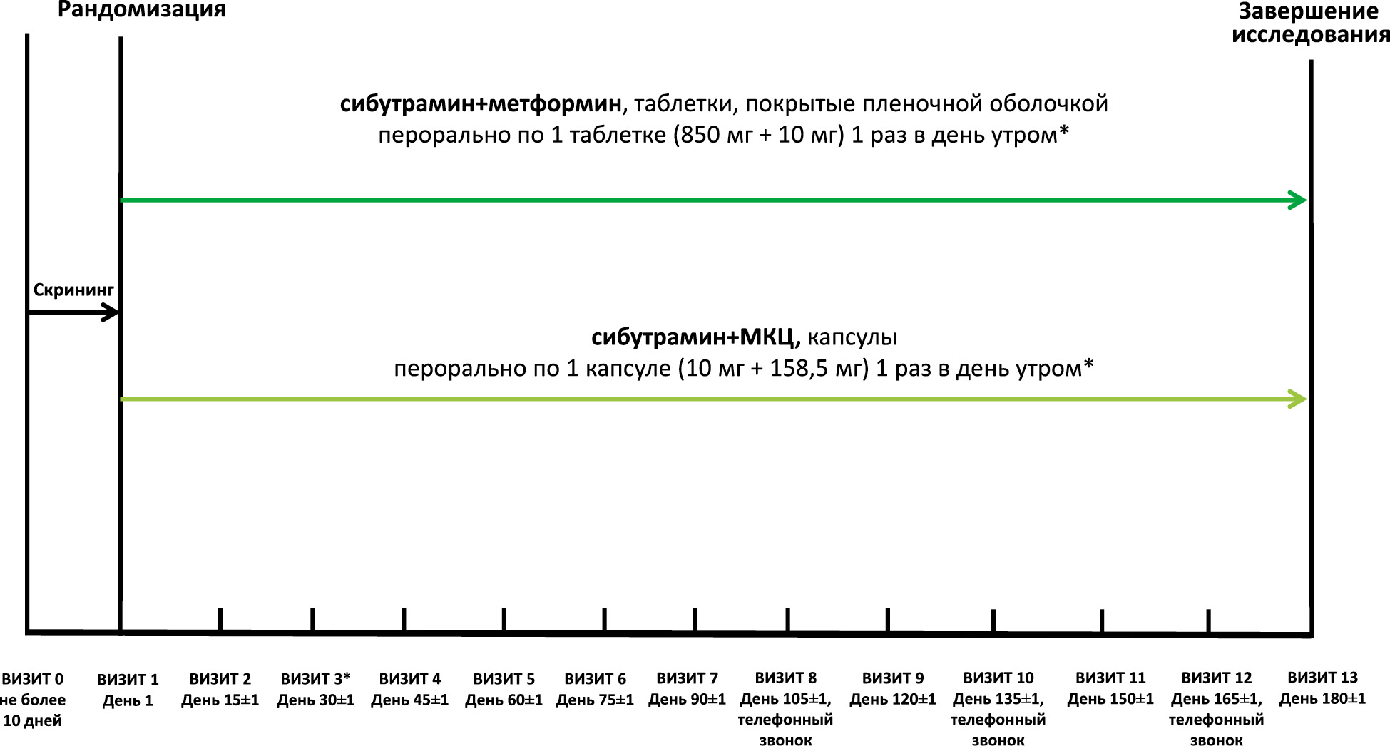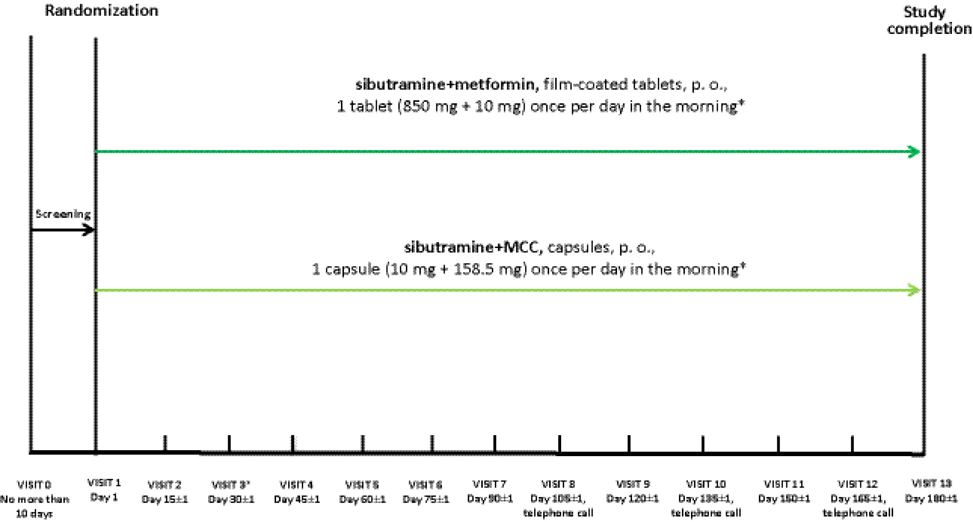 Note: * – at Visit 3 if there is no weight loss of 2 kg compared to Visit 1, the dose will be increased. Patients in the sibutramine+metformin group will receive 1 tablet (850 mg + 15 mg) and patients in the sibutramine+MCC group would received 1 capsule (15 mg + 158.3 mg).