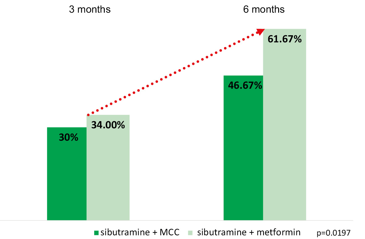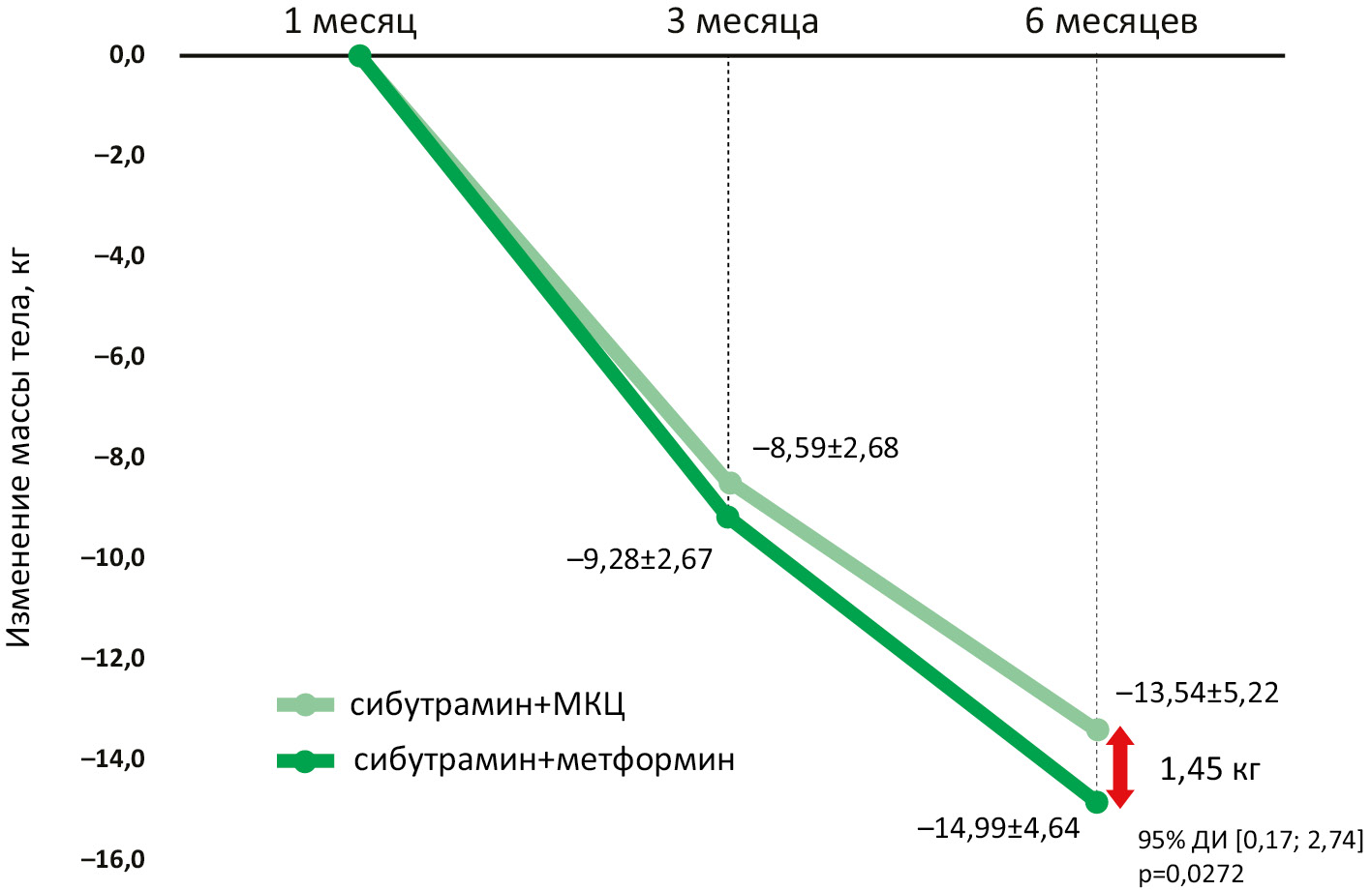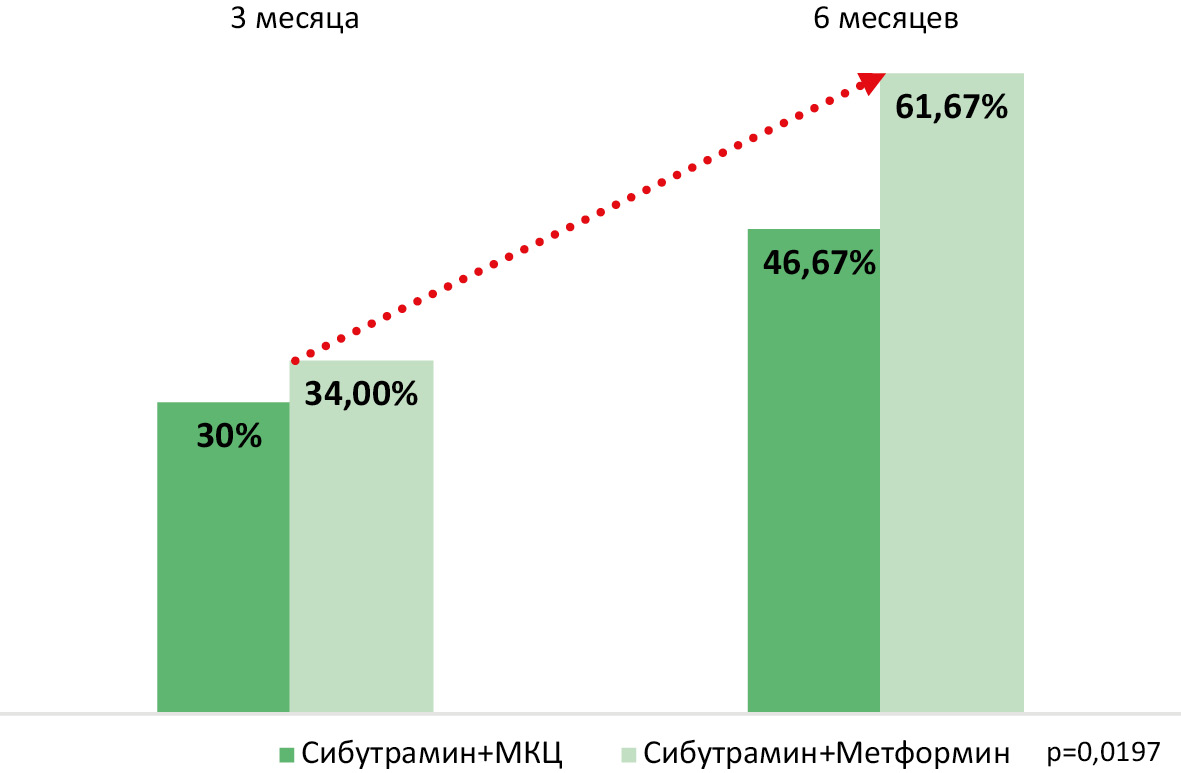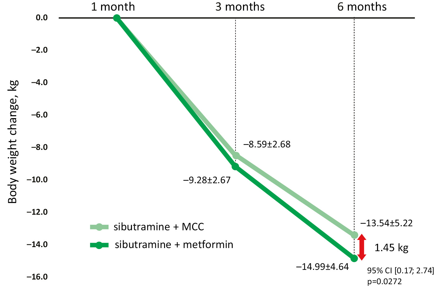 The study was completed by 228 patients (110 patients in the sibutramine + MCC group and 118 patients in the sibutramine + metformin group). The estimation of the study drugs effectiveness, based on the statistical analysis, showed that in the sibutramine + metformin group, the proportion of patients who had achieved more than 5% weight loss by the end of therapy (V13 or 6 months) was 99.15% (117/118), in the sibutramine + MCC group – 93.64% (103/110). As a result of a comparative frequency analysis of achieving more than 5% weight loss to V13, statistically significant differences were detected between the study groups. The difference in proportions was 0.0552 (5.52%), the 95% CI for the difference in proportions was [-0.0019; 0.1233] ([-0.19%; 12.33%]). Thus, it was demonstrated that both study drugs provide a clinically significant decrease in body weight, however, during the therapy with sibutramine + metformin, the effect was more pronounced.