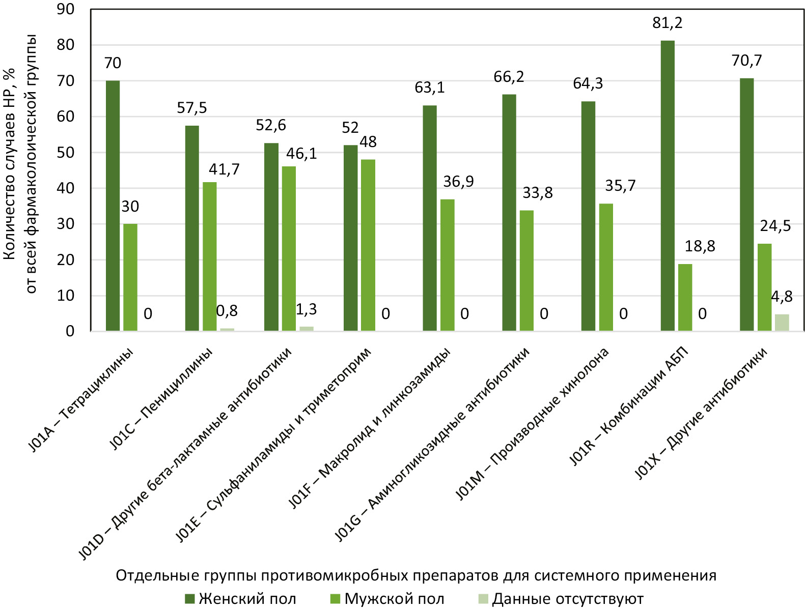 The distribution analysis of the ADRs cases between separate groups of drugs is of research interest. Thus, among antimicrobial agents for systemic use, the “leaders” in the incidence of the ADRs cases were beta-lactam antibiotics of the cephalosporin group (937 cases), penicillins (358 cases), as well as quinolone derivatives (280 cases) and preparations of the macrolides and lincosamides group (122 case). The distribution of the presented groups by gender characteristics is shown i n Fig. 1.