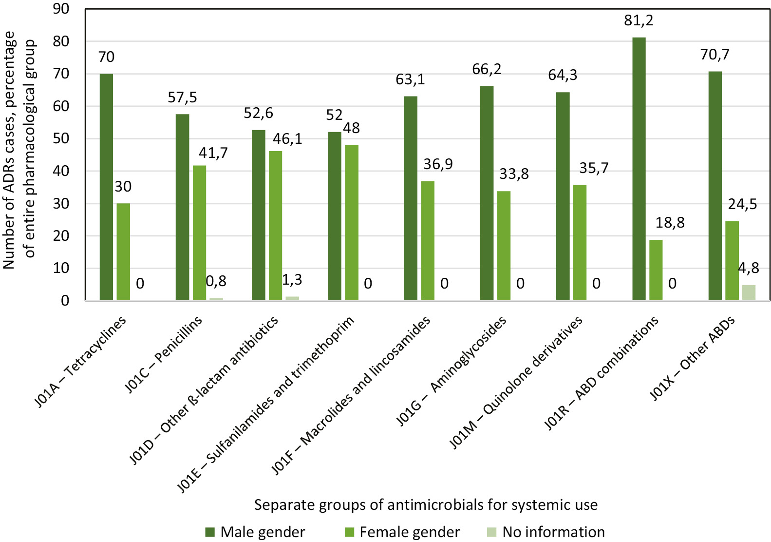 The data gained by De Vries et al., which indicate a higher frequency of the ADRs development with the use of tetracycline, penicillin, beta-lactam antibiotics, except for penicillins, macrolides in females [25].
