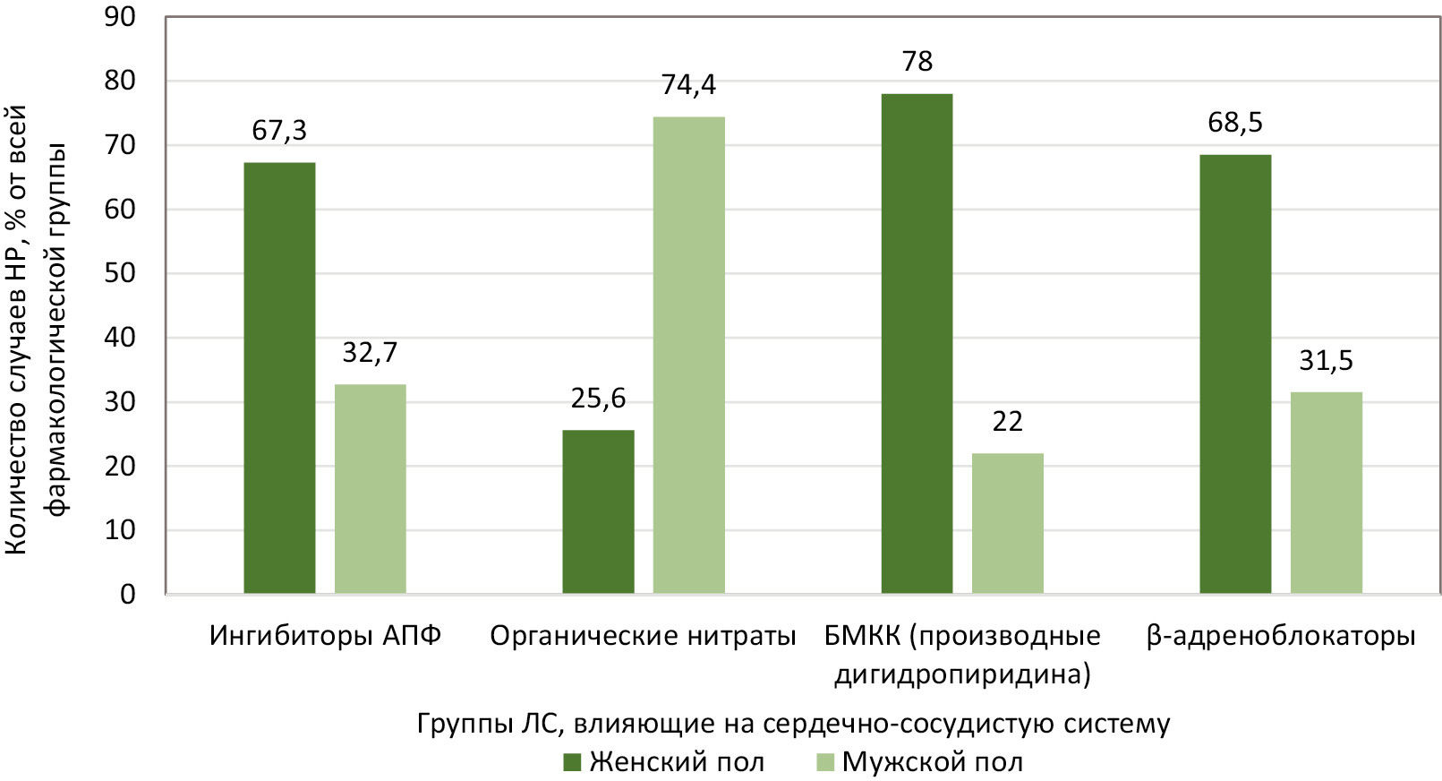 Conclusion. The study of the gender characteristics of the pharmacotherapy safety, carried out on the basis of the notification forms of the ADRs data registered in the Republic of Crimea, confirmed a higher likelihood of developing ADRs in female patients. This may be due to the peculiarities of the pharmacokinetics and pharmacodynamics of drugs in the female body, psychological factors, a more frequent use of drugs by this category of people. The implementation of the drug, taking into account specific features of each gender, can lead not only to better treatment outcomes, but also to increased patients’ compliance.