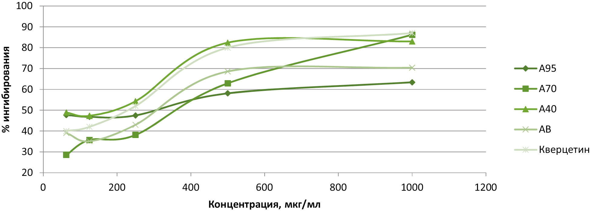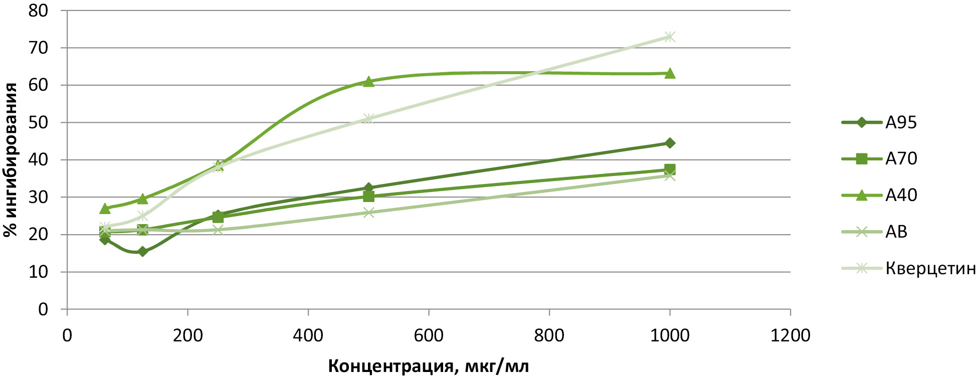 Рисунок 3 – Результаты оценки гидроксил-радикал-ингибирующей активности исследуемых извлечений и кверцетина. Примечание: А95 – извлечение из листьев актинидии, полученное экстракцией спиртом этиловым 95%; А70 –извлечение из листьев актинидии, полученное экстракцией спиртом этиловым 70%; А40 – извлечение из листьев актинидии, полученное экстракцией спиртом этиловым 40%; АВ – извлечение из листьев актинидии, полученное экстракцией водой очищенной.