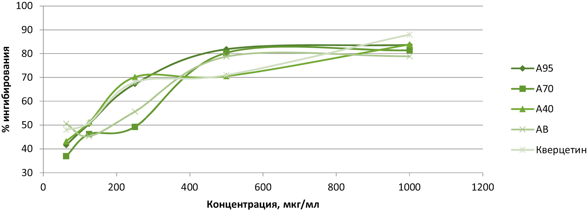 2. Рисунок 1 – Результаты оценки DPPH-ингибирующей активности исследуемых извлечений и кверцетина. Примечание: А95 – извлечение из листьев актинидии, полученное экстракцией спиртом этиловым 95%; А70 –извлечение из листьев актинидии, полученное экстракцией спиртом этиловым 70%; А40 – извлечение из листьев актинидии, полученное экстракцией спиртом этиловым 40%; АВ – извлечение из листьев актинидии, полученное экстракцией водой очищенной.