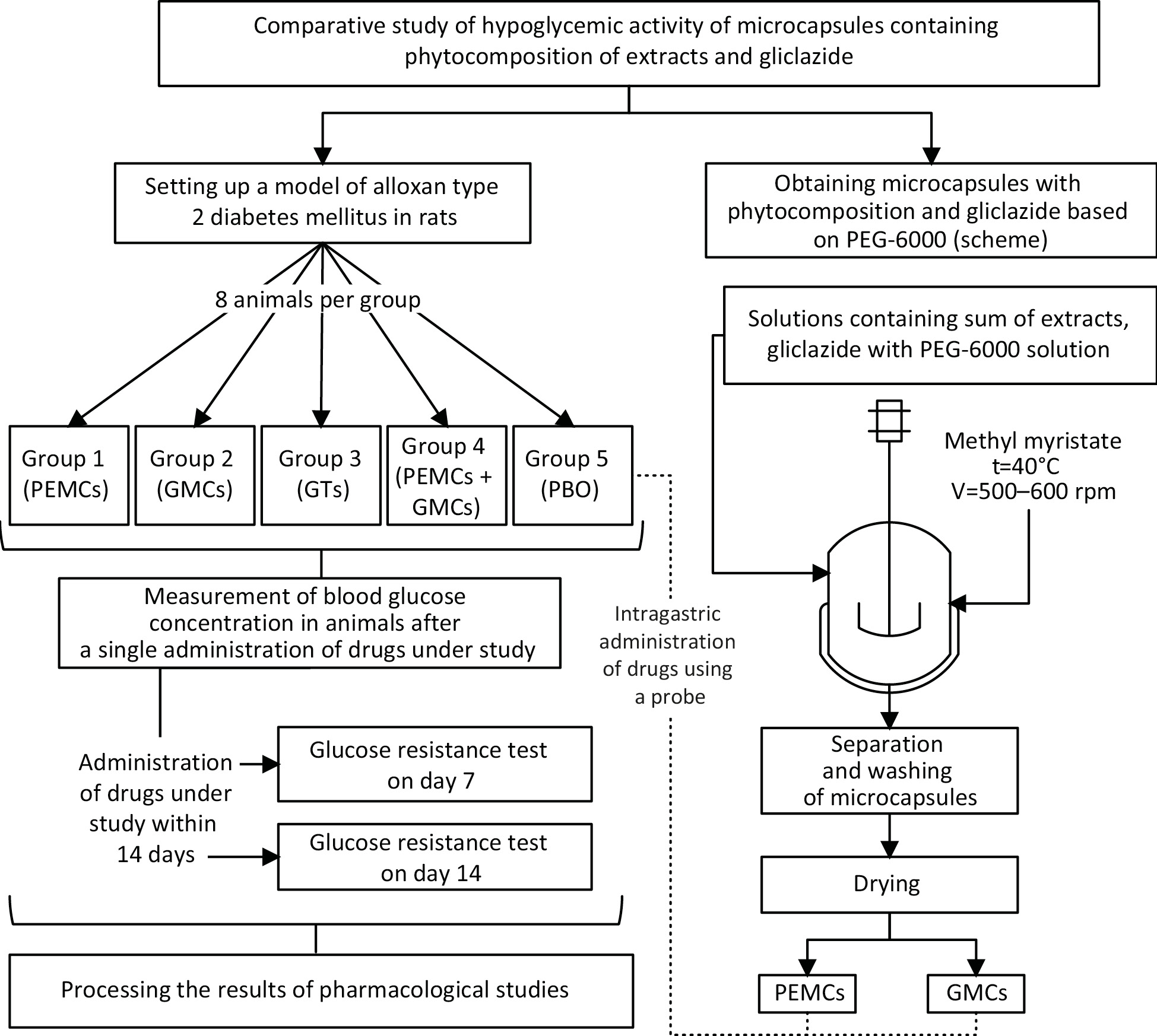 THE AIM of the study was to develop an optimal technology for obtaining microcapsules with a PEG-6000 shell containing a combined antidiabetic substance, and conduct its detailed pharmacological study on the model of type 2 diabetes mellitus, to conduct a detailed comparative pharmacological study of a microencapsulated antidiabetic composition with a shell based on PEG-6000, including gliclazide and a sum of phytoextracts on the model of type 2 diabetes mellitus.