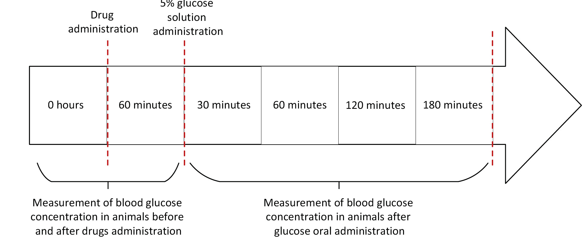 The assessment of hypoglycemic activity (HGA) was carried out by monitoring the concentration of glucose in the blood of animals for 24 hours after a single administration of the study drugs. Taking into account the established cumulative hypoglycemic effect, characteristic of this phytocomposition and confirmed for microcapsules with a gelatin shell, the effectiveness of the developed microcapsules with a shell based on PEG-6000, was studied for a long-term use. For this purpose, tests for the resistance to oral glucose were carried out on days 7 and 14 according to the methods [26, 27]. The general study design of the hypoglycemic activity of the microencapsulated preparations is shown in Fig. 1. The scheme of the test for the glucose resistance is shown in Fig. 2.