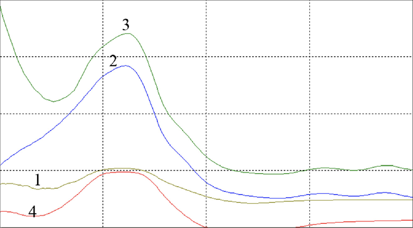 Примечание: 1 – извлечение, полученное экстракцией 90% этанолом; 2 – извлечение, полученное экстракцией 70% этанолом; 3 – извлечение, полученное экстракцией 50% этанолом; 4 – извлечение, полученное экстракцией водой очищенной.