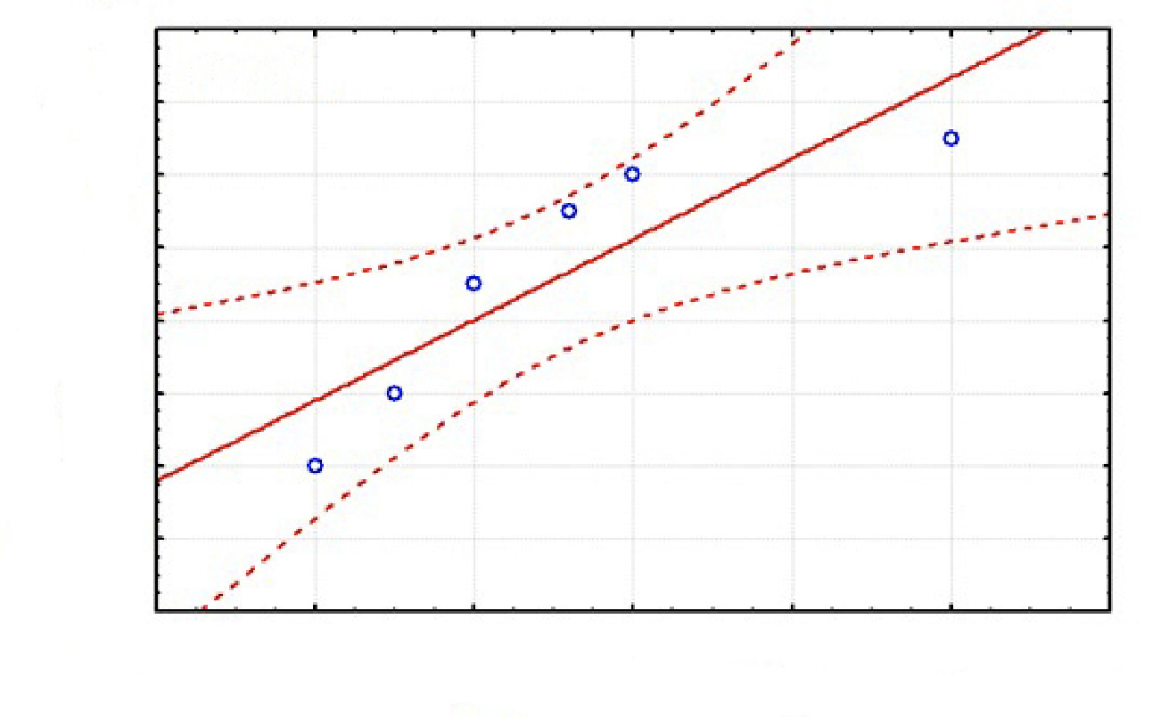 Примечание: на рисунке показаны определяемые показатели (выделены синим); линия тренда корреляционной зависимости (сплошная линия); границы разброса данных (пунктирная линия).