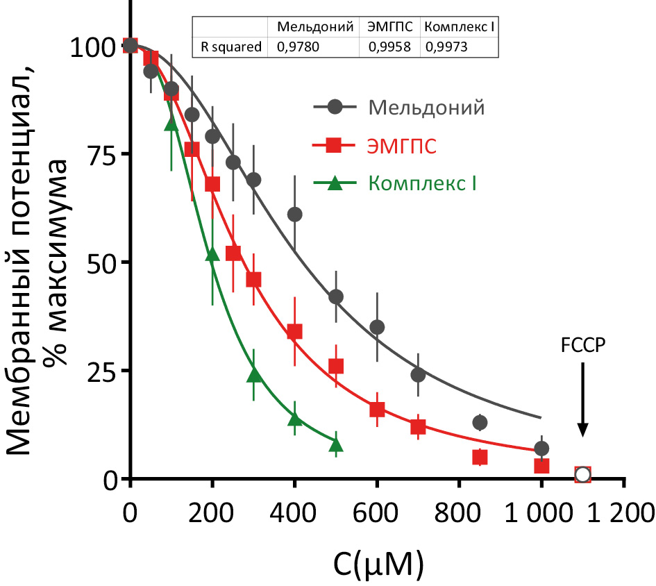 Комплекс компонентов триметилгидразиния пропионата и ЭМГПС снижал потенциал митохондрий до IC50=197±5 µM, что значимо меньше по сравнению только с мельдонием (F (1,15) = 166,5; p <0,0001) или только с ЭМГПС (F (1,22) = 107,5; p <0,0001). При добавлении разобщителя FCCP, потенциал митохондрий снижался до нуля вне зависимости от наличия в инкубационной смеси мельдония, ЭМГПС или изучаемого комплекса (Рис. 1).
