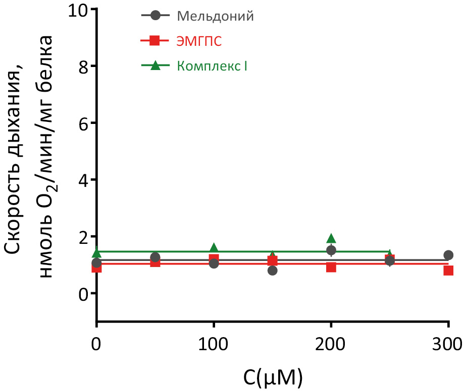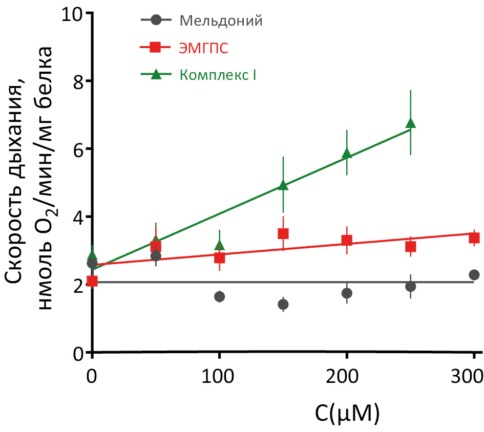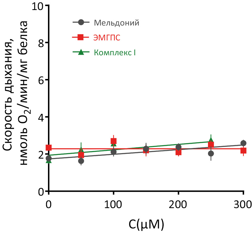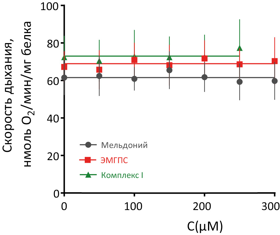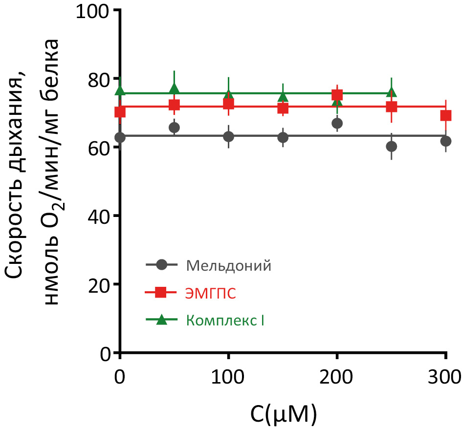 После добавления ингибитора комплекса ротенона (2 µМ), скорость стимулированного пируватом и малатом дыхания митохондрий снижалась практически до нуля и не изменялась в зависимости от концентрации мельдония, ЭМГПС или изучаемого комплекса (Рис. 4).