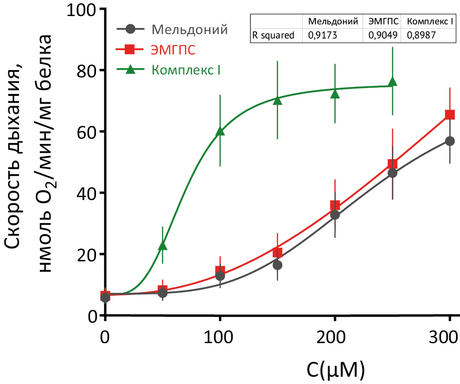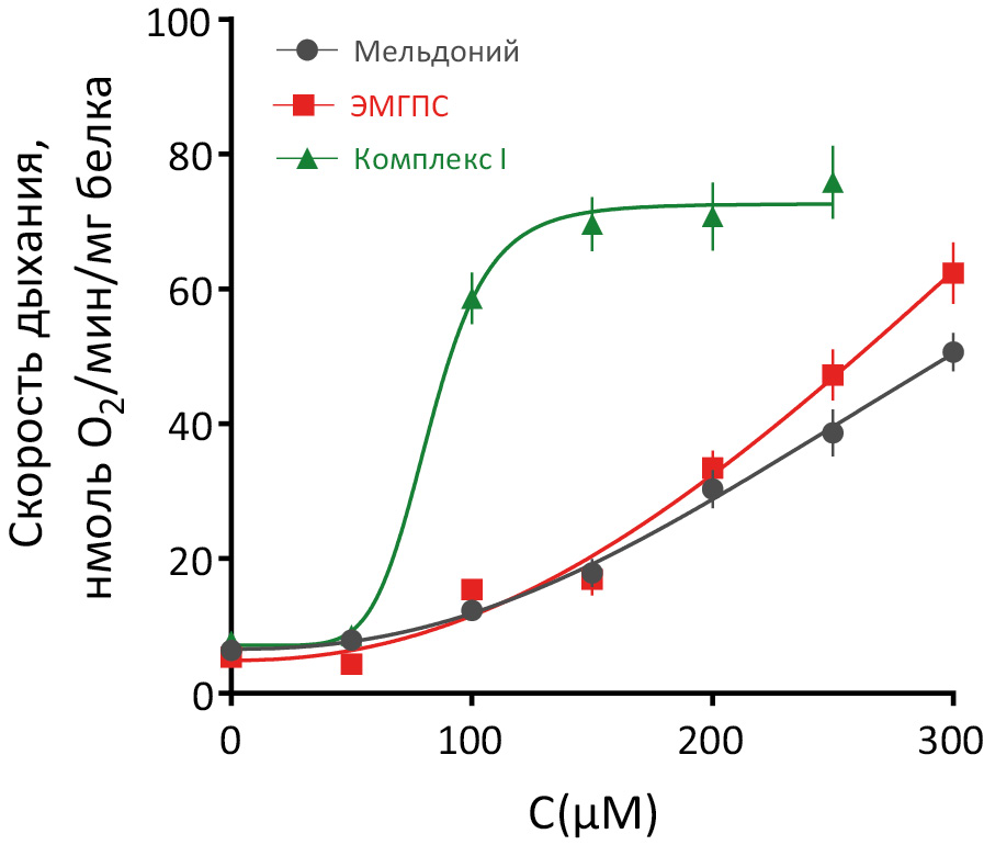 Затем исследовали дыхание митохондрий, стимулированное субстратами комплекса I (НАДФ-коэнзим Q-оксидоредуктазы), пирувата и малата (Рис. 3). Было обнаружено повышение скорости, стимулированного субстратами комплекса I, дыхания при повышении в ячейке концентрации янтарнокислого комплекса ТМГП и ЭМГПС. Полуэффективные концентрации мельдония и ЭМГПС составили 273±67 и 350±204 µМ, соответственно, и значимо не различались (F (1,90) = 0,21; p = 0,6470). Добавление исследуемого комплекса приводило к более выраженному росту потребления кислорода (IC50=75±6 µМ), что значимо меньше по сравнению с мельдонием (F (1,83) = 34,37; p <0,0001) и ЭМГПС (F (1,83) = 30,17; p <0,0001).