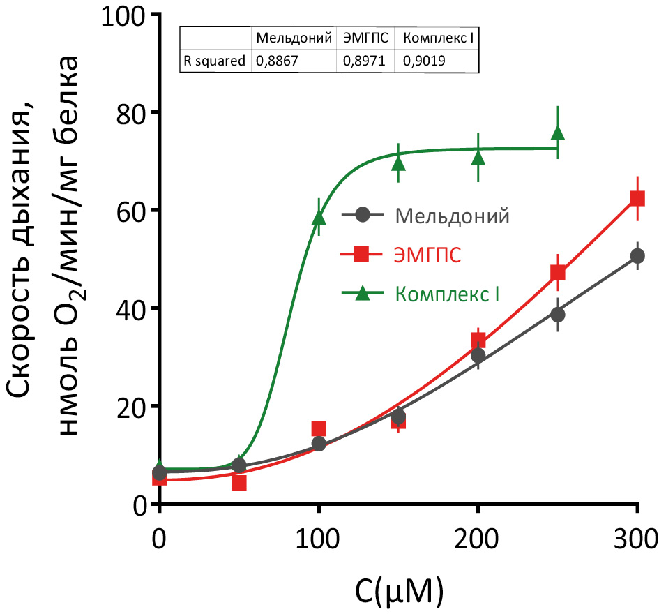 Сукцинат является субстратом комплекса II электрон-транспортной цепи, таким образом, в присутствии ротенона стимулированное сукцинатом дыхание позволяет оценить состояние комплексов II, III и IV электрон-транспортной цепи митохондрий. Как показано на рисунке 5, действие исследуемого комплекса на скорость потребления кислорода при поддерживаемом субстратом второго комплекса электрон-транспортной цепи (ЭТЦ) дыхании было сходно. Полуэффективная концентрация для этих двух веществ составляла 237±81 µМ и 453±1059 µМ и значимо не различалась (F (1,90) = 0,20; p = 0,6596). Эквимолярная смесь компонентов в комплексе стимулировала дыхание с IC50 = 141±27 µМ. Различия с мельдонием (F (1,83) = 3,55; p = 0,0632) и ЭМГПС (F (1,83) = 3,90; p = 0,0516) приближались к уровню статистической значимости.