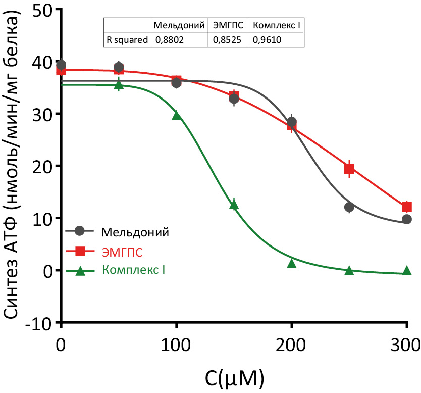 По результатам проведеного эксперимента, было установлено, что мельдоний, ЭПГМС и янтарно-кислый координационный комплекс с триметилгидразинием оказывают выраженное влияние на продукцию митохондриями АТФ (Рис. 10). Так, наименее выраженное влияние на скорость продукции АТФ оказывал ЭМГПС, для которого концентрация полумаксимального ингибирования составляла 321±168 µМ. Полумаксимальное снижение продукции АТФ при добавлении мельдония наблюдалось при концентрации вещества 216±6 µМ. Наиболее выраженное снижение продукции АТФ наблюдалось при добавлении координационного комплекса ТМГП и ЭМГПС с IC50=136±4 µМ.
