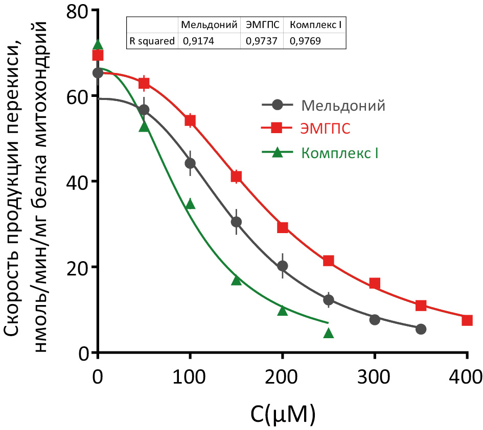Результаты. Было показано, что янтарно-кислый координационный комплекс с триметилгидразинием, являющийся действующим началом лекарственного препарата Брейнмакс®, значимо снижал трансмембранный потенциал митохондрий (IC50=197±5 µM), по сравнению с широко применяемыми препаратами этилметилгидроксипиридина сукцинатом и мельдонием, что облегчает перенос продуцируемых АТФ в клетку и сохраняет жизнедеятельность митохондрий даже в условиях стресса. При исследовании дыхания митохондрий, стимулированном субстратами комплекса I (НАДФ-коэнзимQ-оксидоредуктазы), пирувата и малата, изучаемый препарат приводил к более выраженному росту потребления кислорода с IC50=75±6 µМ. При оценке влияния комплекса на продукцию митохондриями АТФ, наиболее выраженное действие наблюдалось при добавлении изучаемого комплекса, что свидетельствовало о разобщении дыхания и окислительного фосфорилирования при данных концентрациях исследуемых соединений. При оценке влияния комплекса на продукцию изолированными митохондриями перекиси водорода, было показано значимое снижение продукции перекиси в пробах, содержащих комплекс триметилгидразиния пропионата и ЭМГПС.