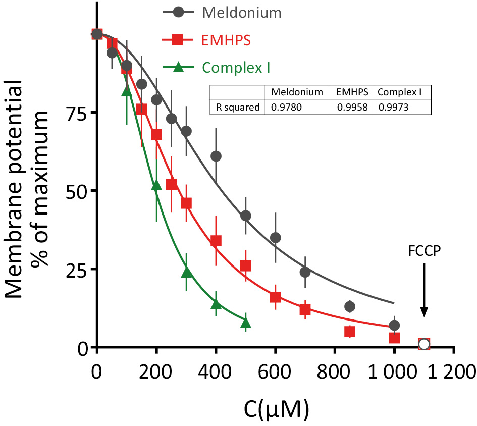 Figure 1 – Dependence of mitochondria membrane potential on a meldonium dose, EMHPS or a complex of trimethylhydrazinium propionate and EMHPS (Complex I)