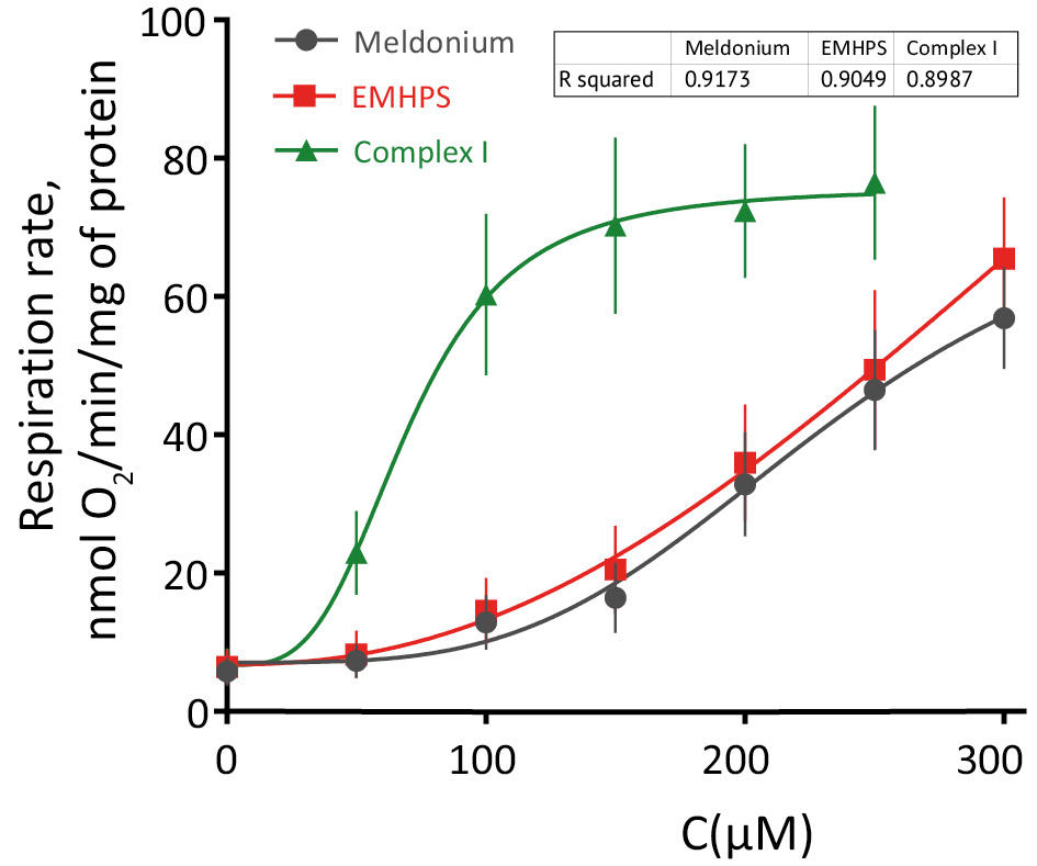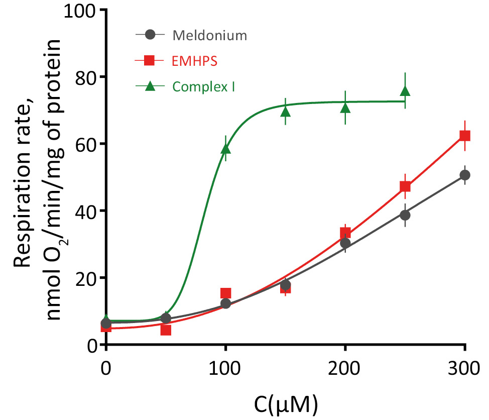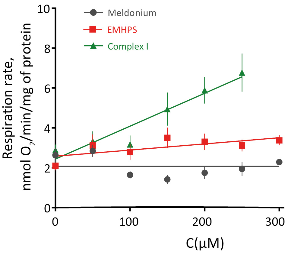 Figure 3 – Respiration rate of mouse liver mitochondria stimulated with 5 mM pyruvate and 1 mM malate in presence of meldonium, EMHPS or a complex of components (Complex I)