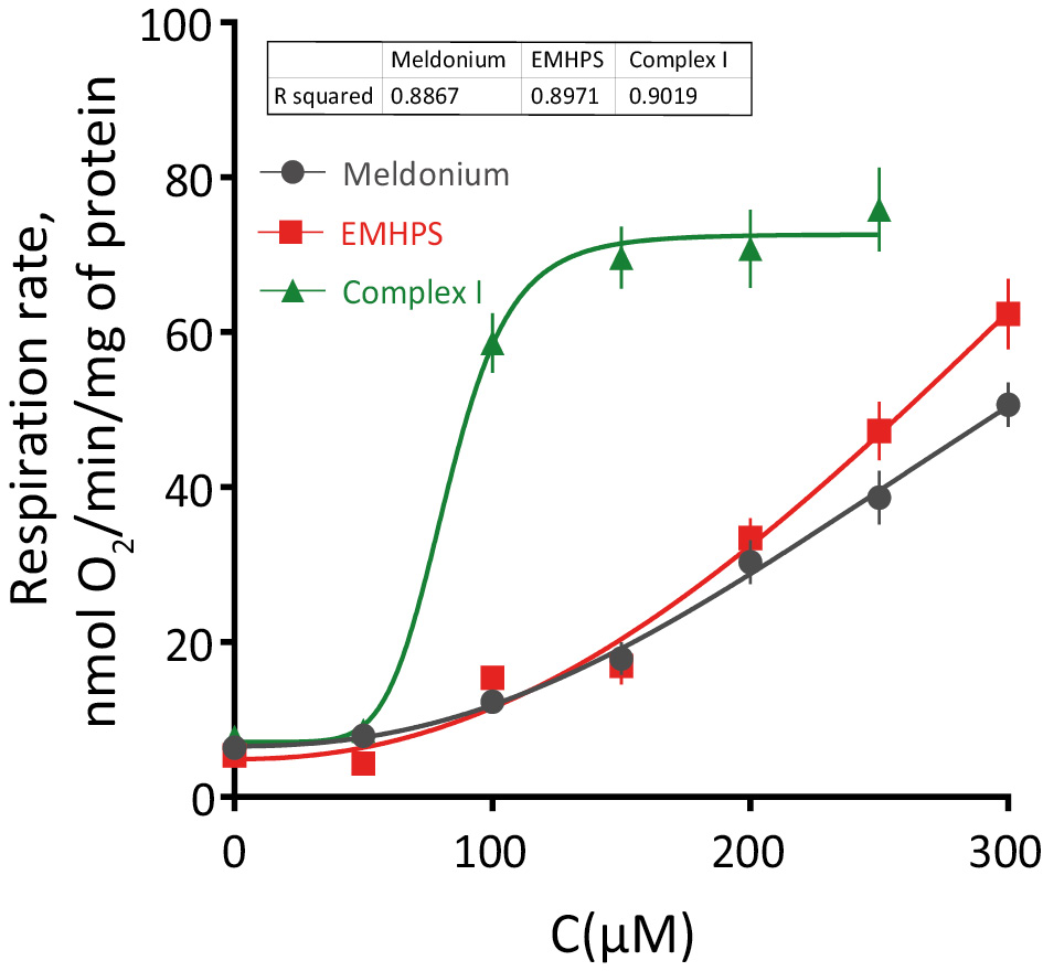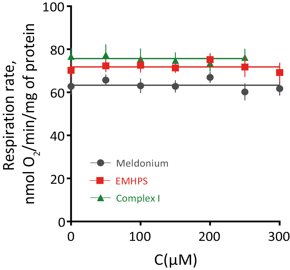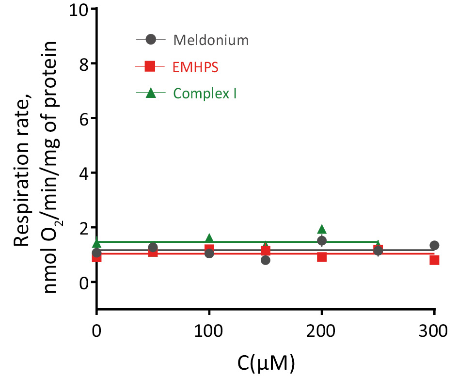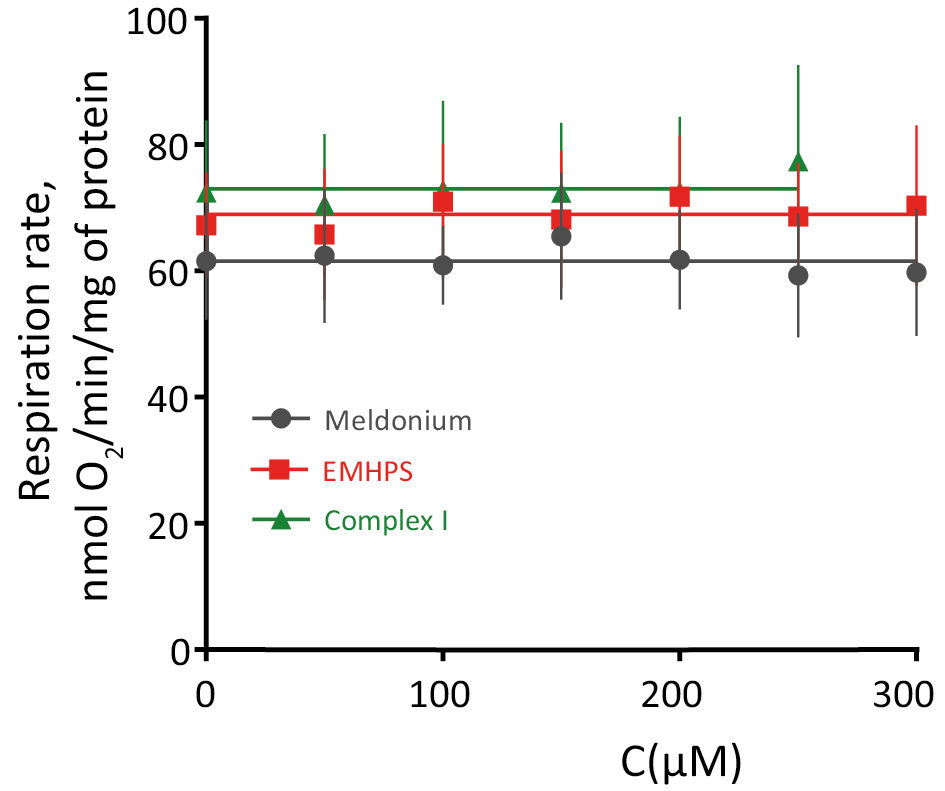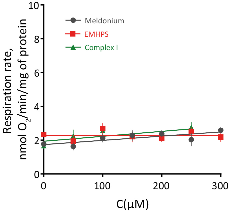 After the addition of the complex inhibitor rotenone (2 µM), the rate of pyruvate-malate-stimulated mitochondrial respiration decreased almost to zero and did not change depending on the concentration of meldonium, EMHPS, or studied complex (Fig. 4).