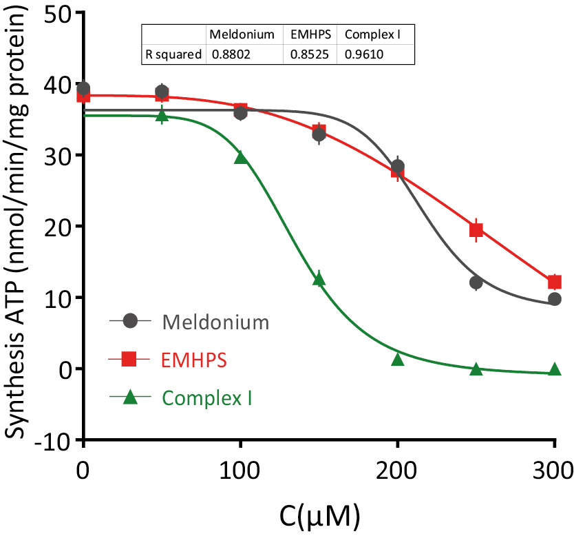 According to the results of the experiment, it was found out that meldonium, EPGMS and succinic acid coordination complex with trimethylhydrazinium have a pronounced effect on the ATP production by mitochondria (Fig. 10). Thus, the least pronounced effect on the rate of the ATP production was exerted by EMHPS, for which the concentration of the half-maximal inhibition was 321±168 µM. A half-maximal decrease in the ATP production with the addition of meldonium was observed at the substance concentration of 216±6 µM. The most pronounced decrease in the ATP production was observed with the addition of the TMHP coordination complex and EMHPS with IC50=136±4 µM.