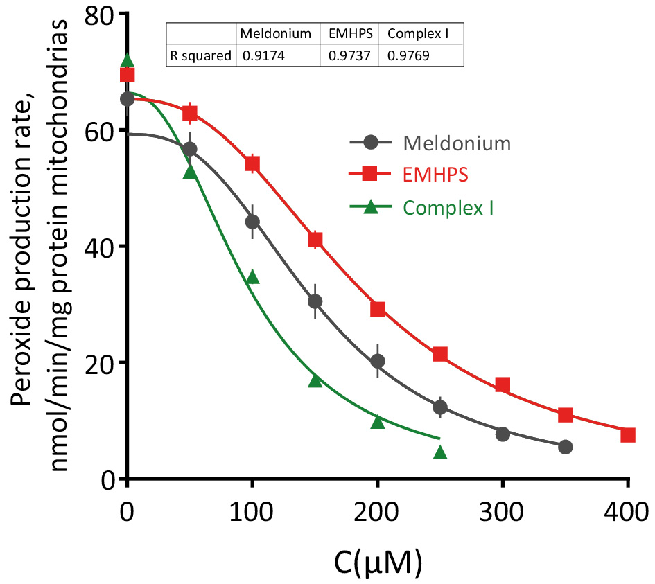 The peroxide production rate was evaluated fluorometrically. As shown in Fig. 11, TMHP, EMHPS and their complex reduced the hydrogen peroxide production by isolated mitochondria. EMHPS had the least effect on the peroxide generation (EC50=186±6 µM), which is significantly less than that of TMHP (IC50=153±11 µM, F (1.113) = 16.36, p <0.0001). The greatest suppression of the peroxide production was observed when complex of meldonium and EMHPS were added to the isolated mouse liver mitochondria (IC50=96±10 µM), which was significantly less than for meldonium alone (F (1.92) = 68.94, p <0.0001) or for EMHPS alone (F (1.99) = 310.2, p <0.0001). These results indicate a pronounced decrease in the production of reactive oxygen species and the antioxidant effect of the complex under consideration, which determines its protective effect on cells under conditions of ischemia and hypoxia.
