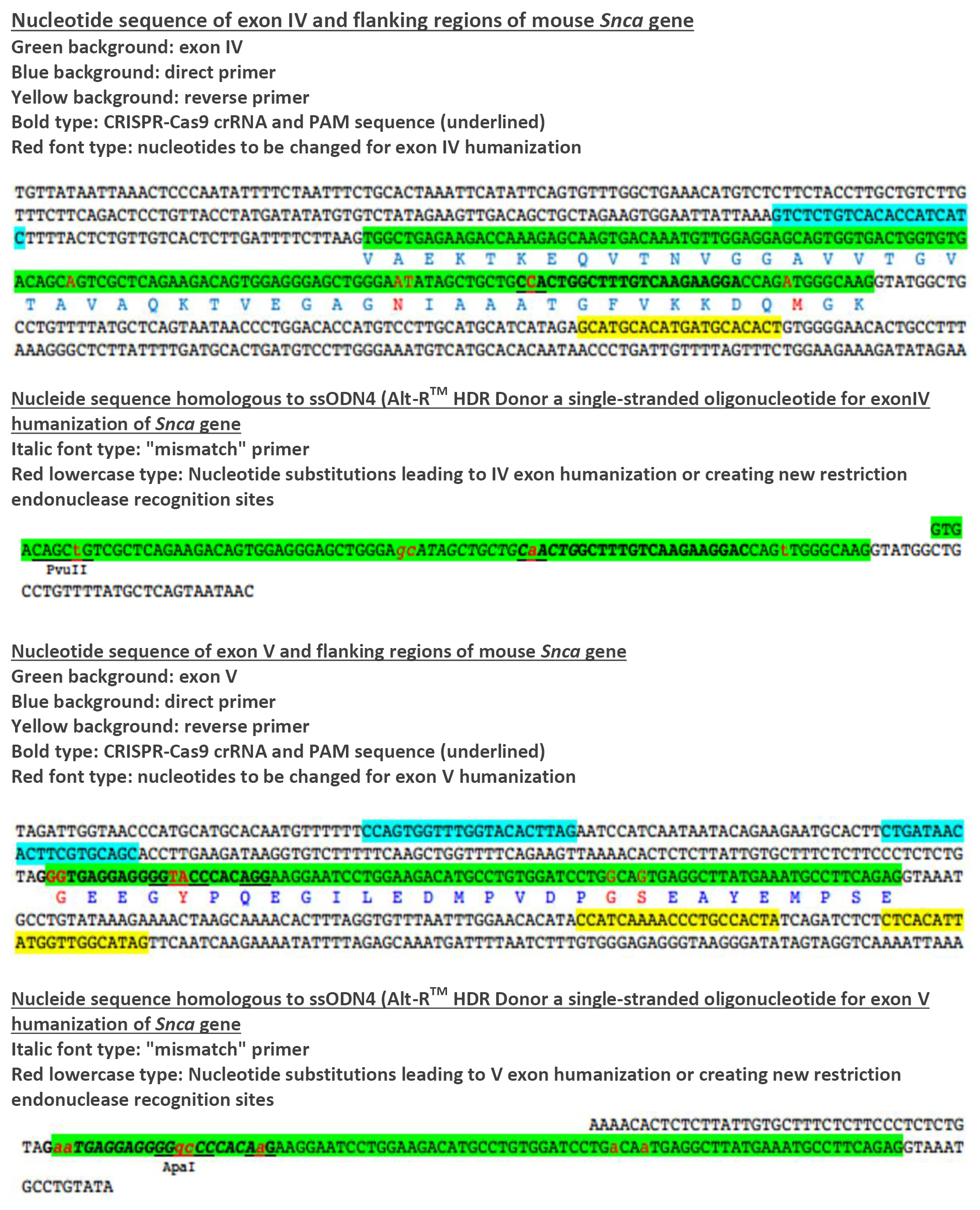 sgRNA5 (Alt® CRISPR-Cas9 sgRNA for humanization of Snca gene exon V) | 5’- mG*mG*mG*UGAGGAGGGGUACCCACGUUUUAGAGCUArGAAAUAGCAAG UUAAAAUAAGGCUAGUCCGUUAUCAACUUGAAAAAGUGGCACCGAGUCGGUGC mU*mU*mU*U -3’ | RNA |