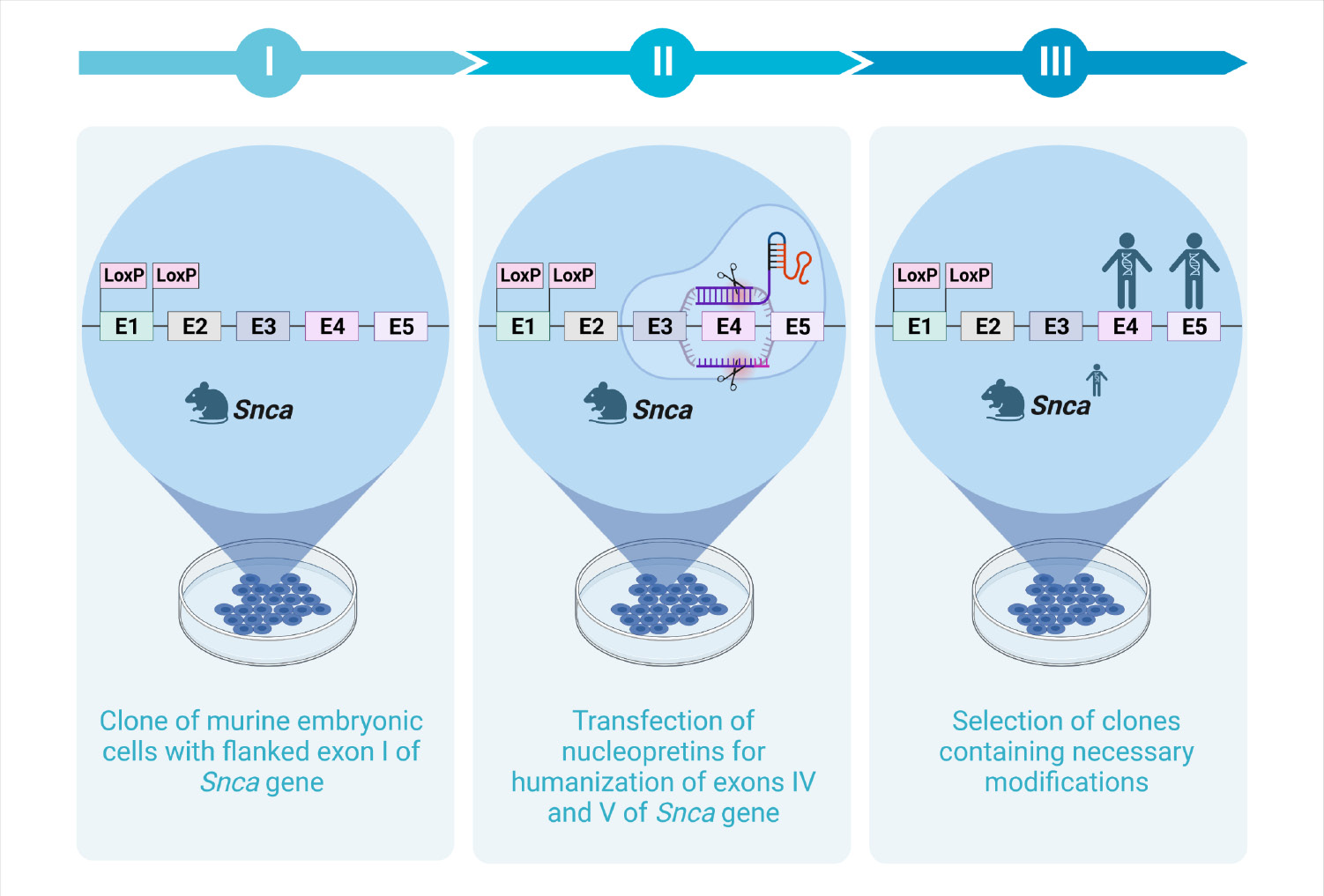 Note: I – to create a clone of mouse embryonic stem cells with a conditional knockout of the humanized Snca gene, the cells with the first Snca exon flanked by LoxP sites, were taken; II – by transfection of CRISPR/Cas9, guide RNAs and fragments of exons IV and V of human Snca for homologous repair, the mouse Snca gene was humanized; III – after the modification by the allele-specific PCR and restriction analysis, the selection of clones carrying the necessary modification, was carried out.