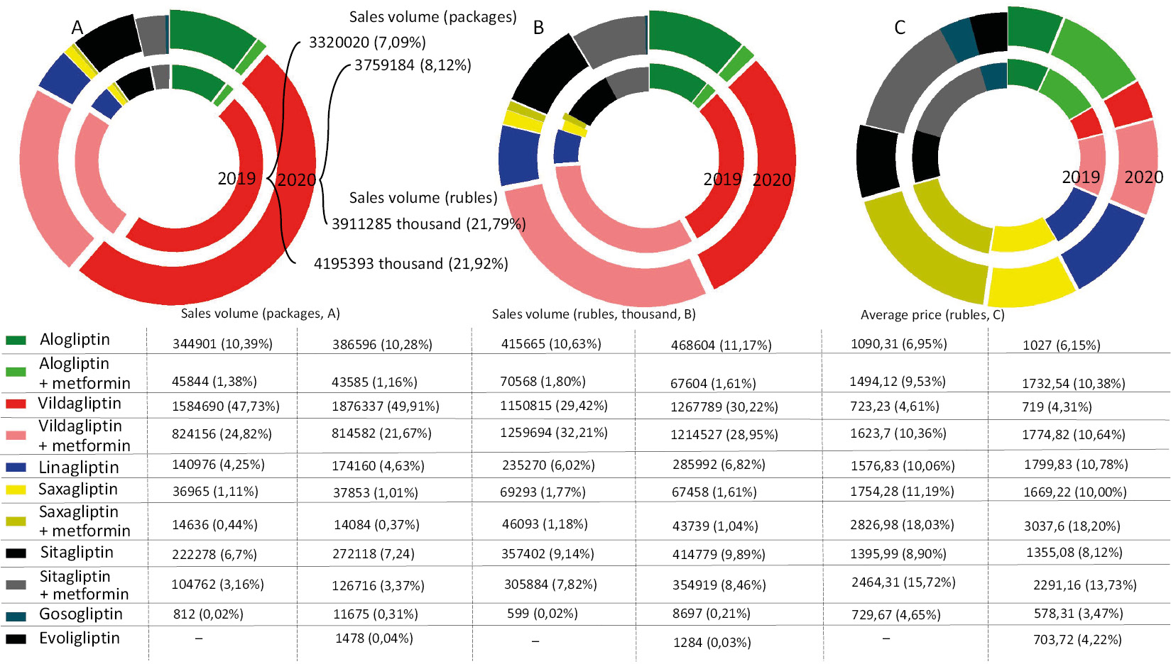 Dipeptidyl peptidase-4 (DPP-4) inhibitors have a moderate hypoglycemic activity and are often used to create rational combinations of hypoglycemic drugs. The drugs of this pharmacotherapeutic group including the ones created by leading pharmaceutical companies around the world [9] have been developed for more than 30 years. A distinctive feature of the drugs with an incretins activity, which also include DPP-4 inhibitors, is a number of pleiotropic effects associated with a decrease in the risk of developing cardiovascular DM complications [10]. In Russia, DPP-4 inhibitors are actively used in the DM combination therapy. The characteristics of the domestic market for DPP-4 inhibitors are summarized in Fig. 1.