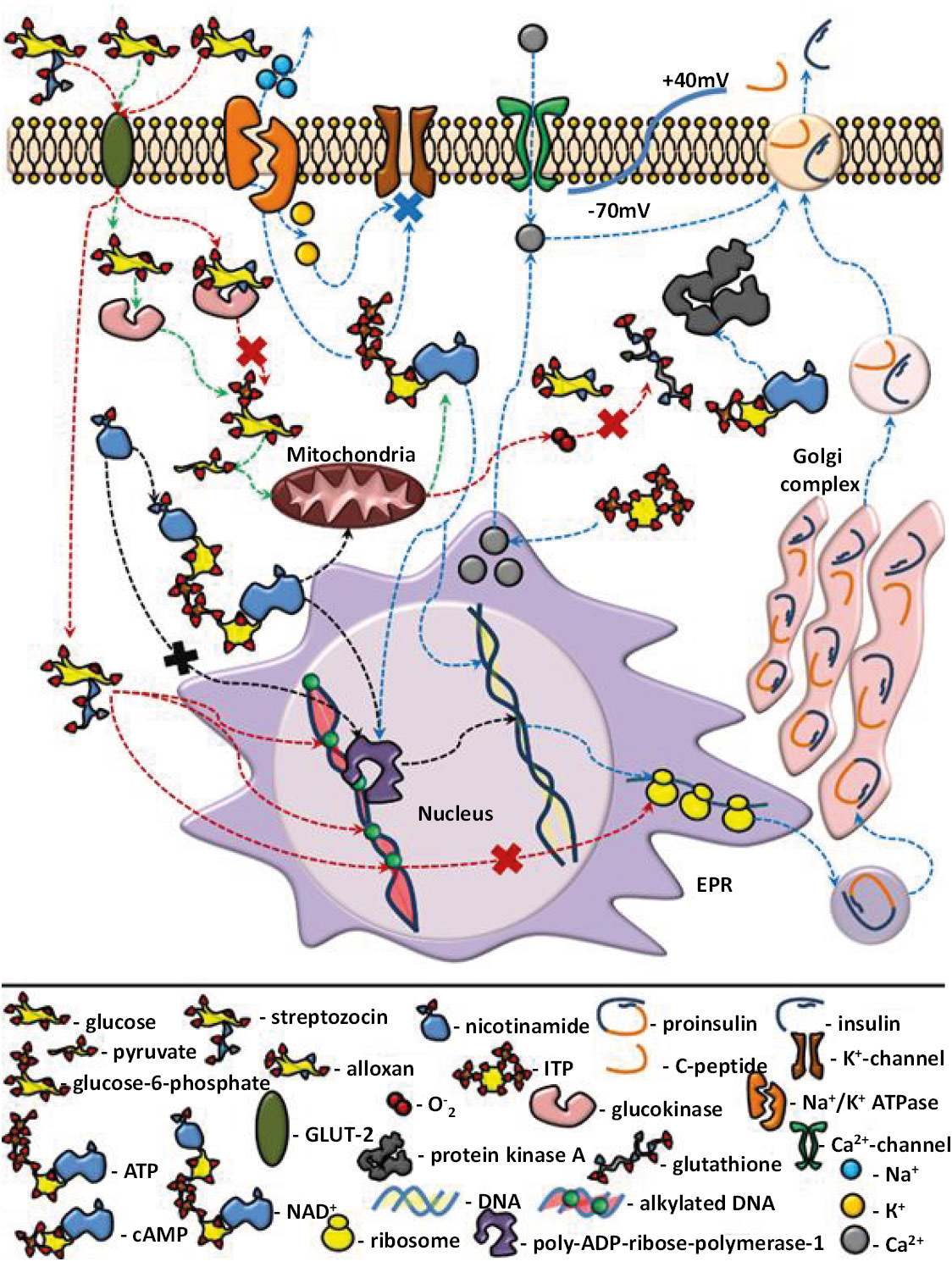 Note: ADP, adenosine diphosphate; ATP – adenosine triphosphate; GLUT-2, glucose transporter, type 2; DNA – deoxyribonucleic acid; ITP, inositol 1,4,5-triphosphate; mV – millivolt; NAD+, nicotinamide adenine dinucleotide (oxidized); cAMP – cyclic adenosine monophosphate; EPR – endoplasmic reticulum.