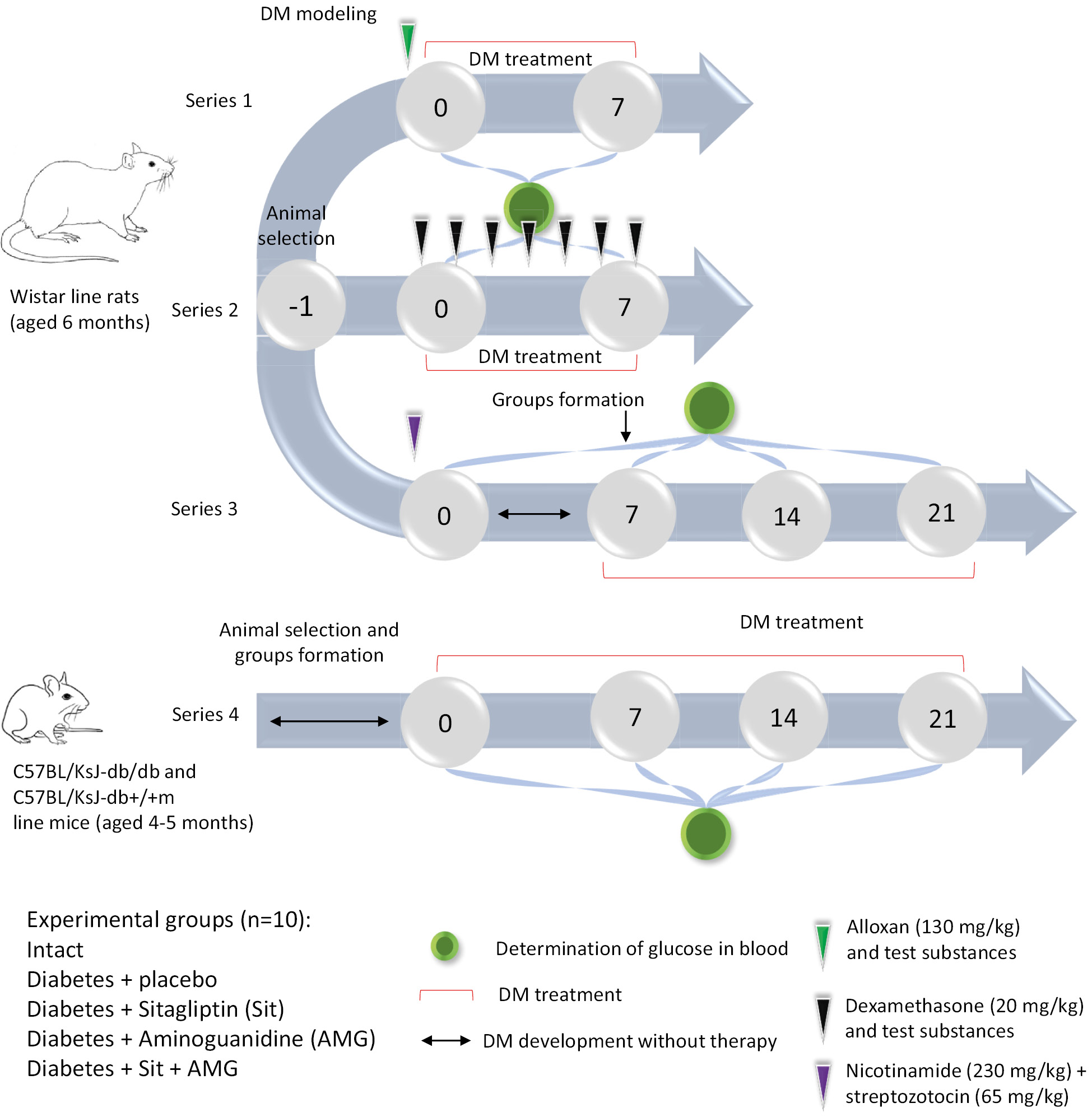 The overall design of the study is presented below on Figure 3. The study was performed in 4 series: in the first series, the treatment was started 3 h after the alloxan administration, in the second – simultaneously with the first injection of dexamethasone, in the third – after 7 days after the streptozotocin administration, and in the fourth – after quarantine and distribution into groups. Sitagliptin (Januvia, 10 mg/kg/day, per os) or aminoguanidine (Sigma, 25 mg/kg/day, i.p.) or their combination, were administered as a treatment (the dose, regimen, and an administration route for each drug remained unchanged). In the 1 and 2 series, in which the treatment had been started before the pathology development, the animals were divided into the groups randomly before the administration of the study drugs. In the 3 series (streptozotocin-nicotinamide-induced DM) and in the 4 series (the obese mice), the level of glycemia was preliminarily measured in the animals with developed pathology. The rats and mice with fasting glycemia levels of more than 11 mmol/l were subjected to the randomization to the experimental groups. The treatment was started immediately after the division into groups. The effectiveness of the therapy was assessed by measuring the concentration of glucose (glucometer Kontur TC, Bayer, Germany) in the blood after 4 h of fasting and/or during an oral glucose tolerance test (OGTT). During that test, the level of glycemia was recorded before and after 60 and 120 min after the oral administration of an aqueous 40% glucose solution at the dose of 4 g/kg, followed by the calculation of the area under the “glycemic level-time” curve (AUC0-120).