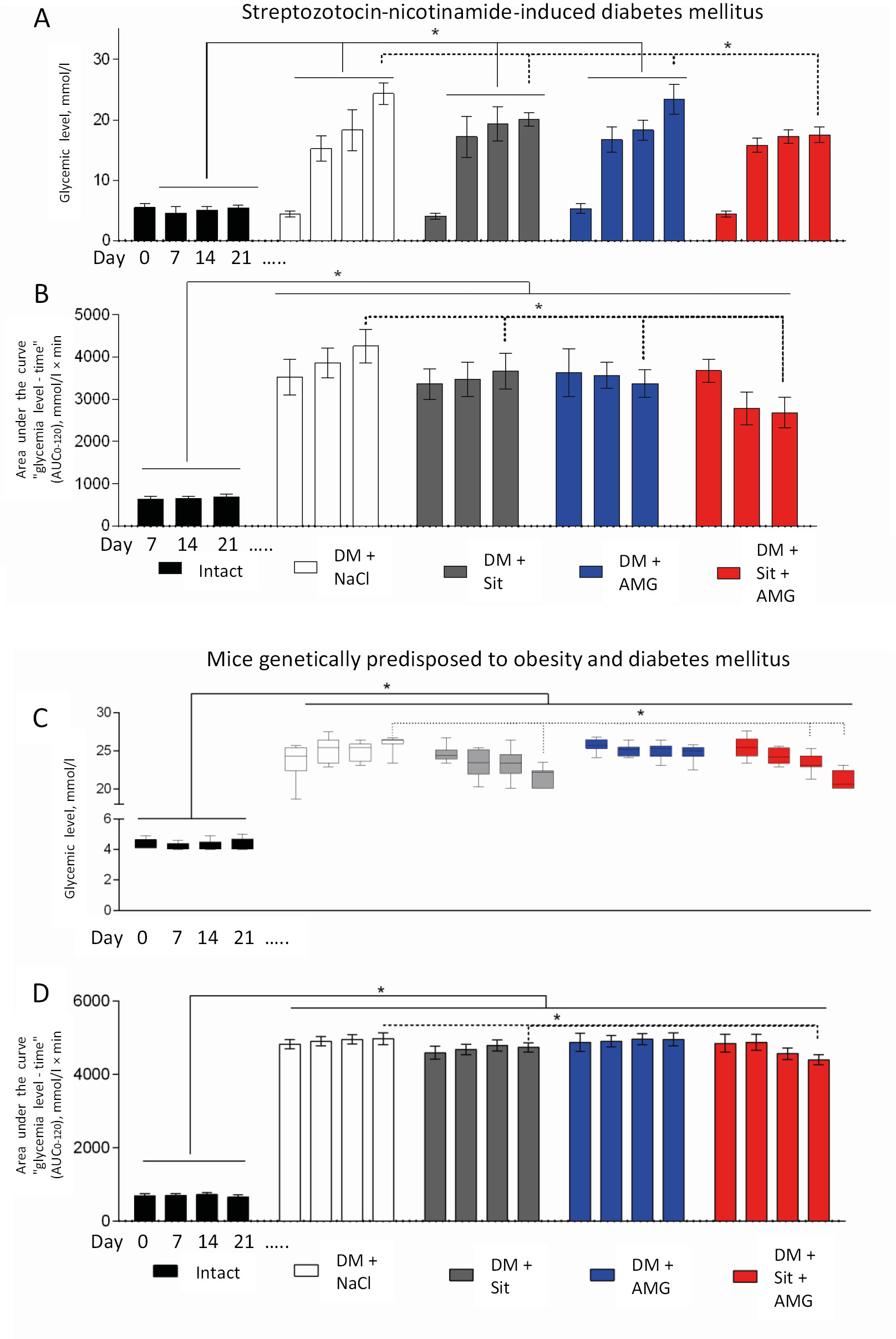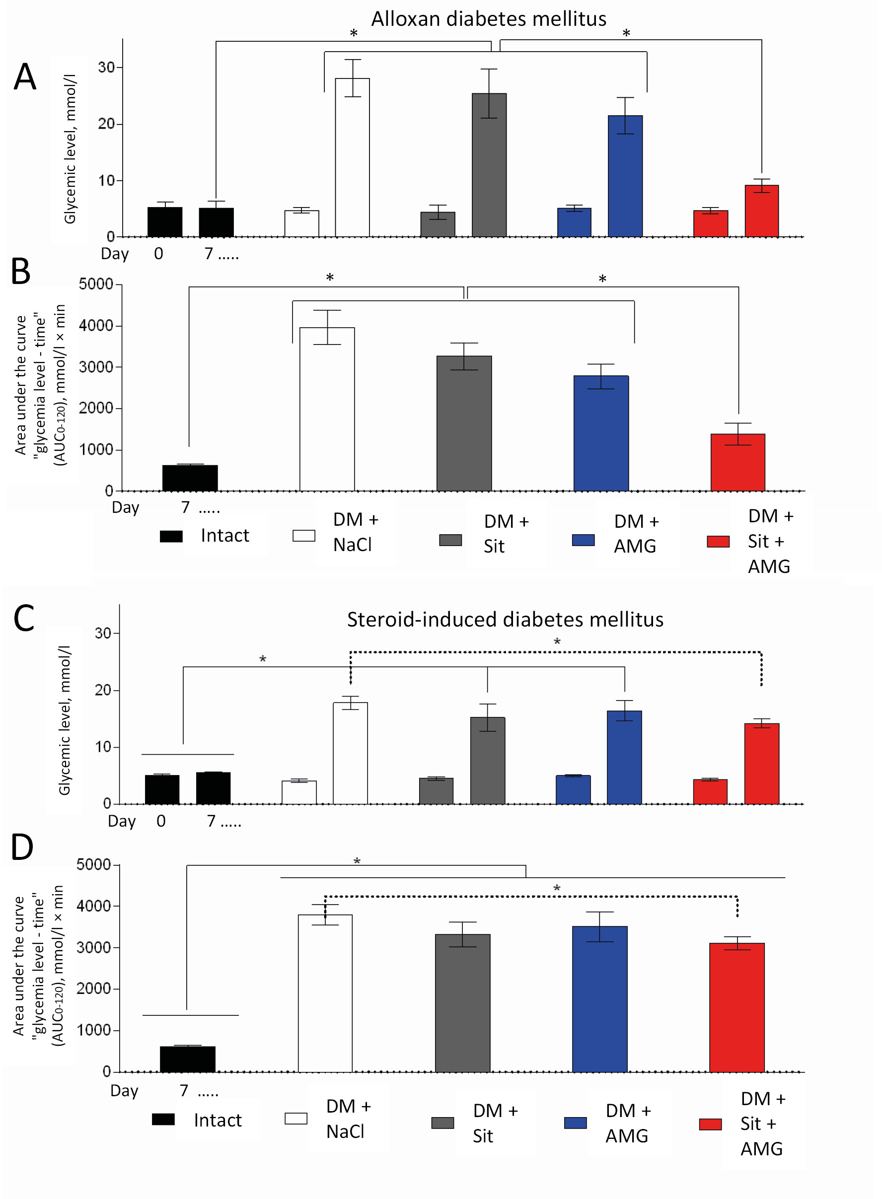 days after treatment of diabetes mellitus caused by the alloxan administration; C – the first column – values before modeling DM (dexamethasone, day 0), second – after treatment (day 7); D – AUC0-120 7 days after treatment for dexamethasone-induced DM; * – p<0.05 one-way analysis of variance with Newman-Keuls post-hoc test; compared samples are indicated by lines.