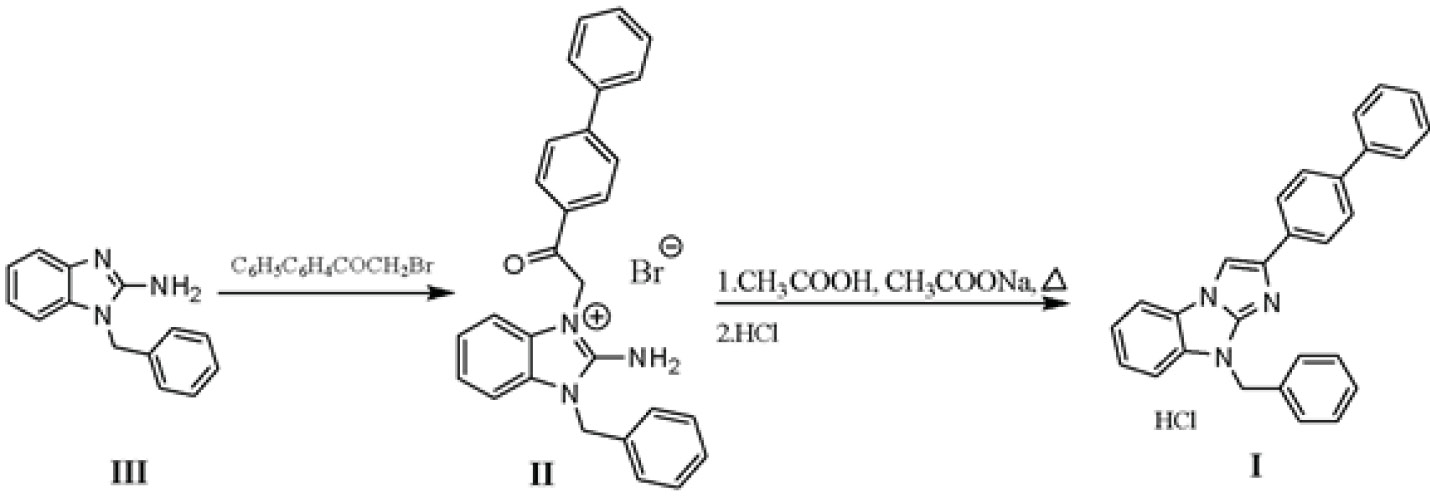 Соединение I синтезировано из 2-амино-1-бензилбензимидазола (III) в ходе последовательных реакций, изображенных на рисунке 1, как описано ранее [21], но с дополнительной модификацией стадии 2. На первой стадии амин III кватернизовали с применением эквимолярного количества 4-(бромацетил)бифенила (MeCN, комнатная температура, 6–8 ч) с получением выхода соли III. Затем на завершающей стадии эту соль подвергли циклизации в среде MeCOOH (кипячение, 5 ч) в присутствии ацетата натрия. Выход соединения I составил 92%, что значительно больше, чем при циклизации соли III в водн./EtOH среде [21], а время реакции в этом случае значительно меньше. Отметим, что при кипячении ДМФА циклизация протекает еще быстрее (15–20 мин), но с низким выходом.